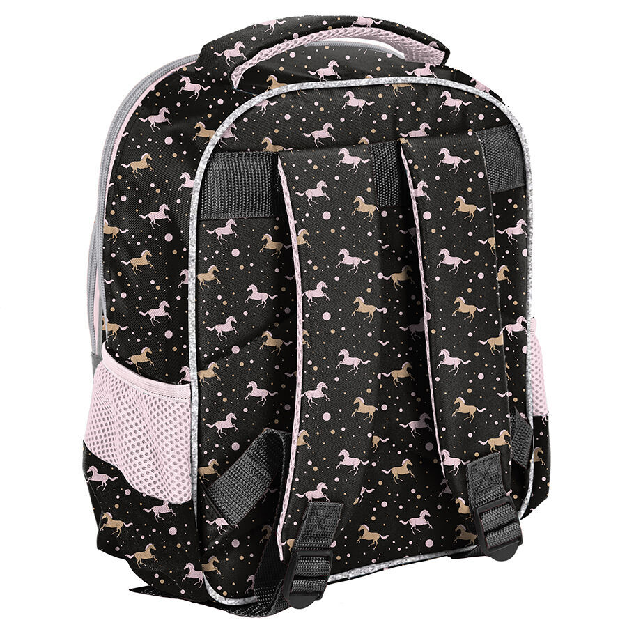 Plecak przedszkolny Lovely horses. Stanowi idealne rozwiązanie dla dzieci uczęszczających do przedszkola lub klasy zerowej. Plecak wyposażony jest w jedną komorę oraz praktyczną kieszeń na przedniej części. Posiada lekko usztywnione plecy, uchwyt do przenoszenia oraz regulowane, wyściełane szelki. Dodatkowo, dwie boczne kieszenie z siatki umożliwiają przechowywanie bidonu, małej butelki lub termosu.