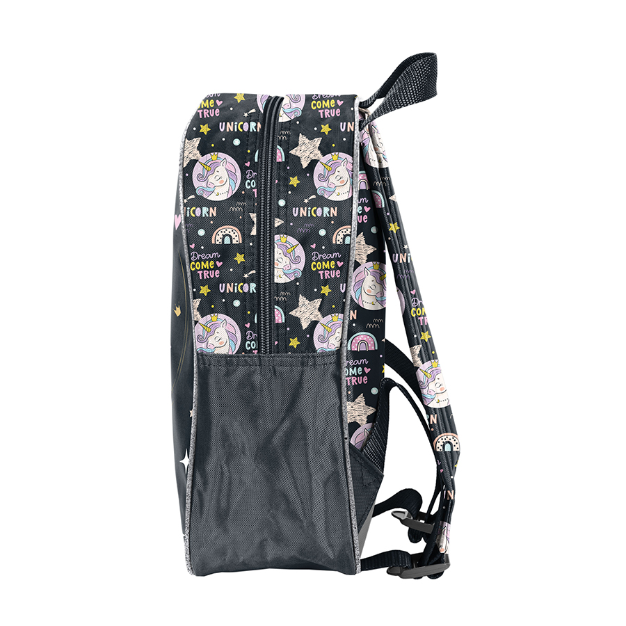 Mały plecak przedszkolny Jednorożec. Posiada jedną komorę oraz boczną kieszonkę wykonaną z siatki, w której można przechować małą butelkę, bidon lub termos. Plecak wyposażony jest w regulowane szelki, dzięki którym można idealnie dostosować plecak do wzrostu dziecka. Plecak ma wygodny uchwyt do przenoszenia oraz ozdobne pullery. Idealny dla młodszych dzieci, na szkolną wycieczkę, zajęcia pozalekcyjne czy do przedszkola.