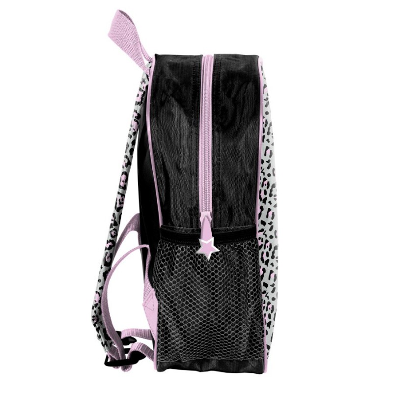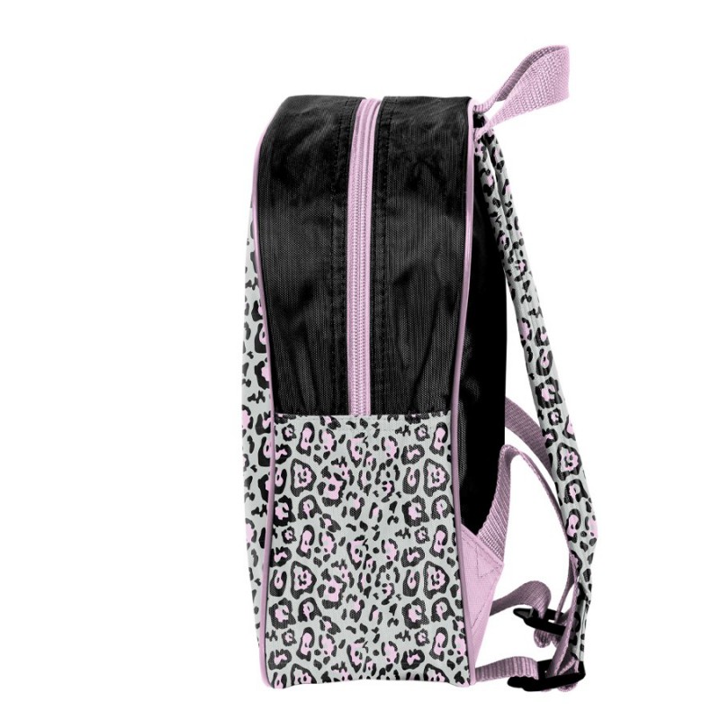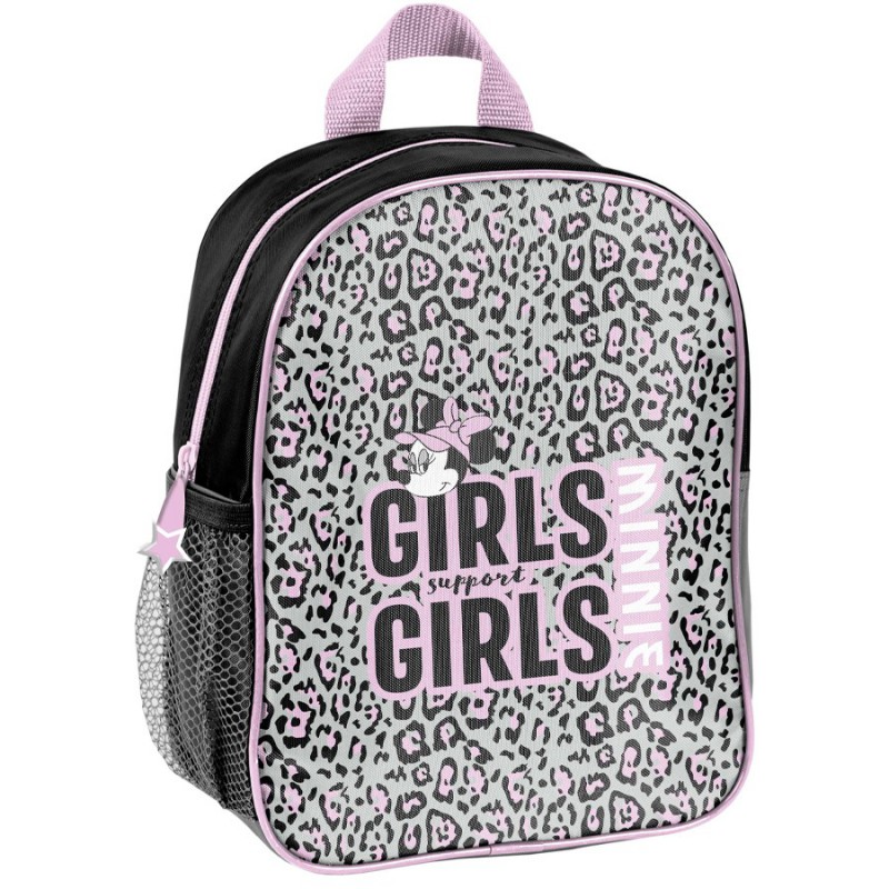 Mały plecak przedszkolny Minnie. Posiada jedną komorę oraz boczną kieszonkę wykonaną z siatki, w której można przechować małą butelkę, bidon lub termos. Plecak wyposażony jest w regulowane szelki, dzięki którym można idealnie dostosować plecak do wzrostu dziecka. Plecak ma wygodny uchwyt do przenoszenia oraz ozdobne pullery. Idealny dla młodszych dzieci, na szkolną wycieczkę, zajęcia pozalekcyjne czy do przedszkola.