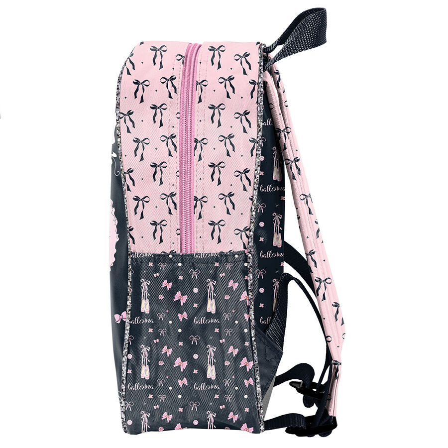 Mały plecak przedszkolny Dancing with heart Baletnica. Posiada jedną komorę oraz boczną kieszonkę wykonaną z siatki, w której można przechować małą butelkę, bidon lub termos. Plecak wyposażony jest w regulowane szelki, dzięki którym można idealnie dostosować plecak do wzrostu dziecka. Plecak ma wygodny uchwyt do przenoszenia oraz ozdobne pullery. Idealny dla młodszych dzieci, na szkolną wycieczkę, zajęcia pozalekcyjne czy do przedszkola.