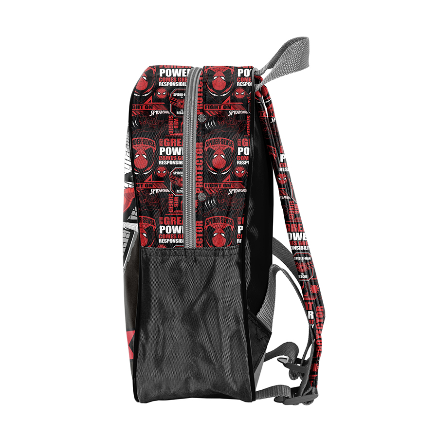 Mały plecak przedszkolny Spider-Man. Posiada jedną komorę oraz boczną kieszonkę wykonaną z siatki, w której można przechować małą butelkę, bidon lub termos. Plecak wyposażony jest w regulowane szelki, dzięki którym można idealnie dostosować plecak do wzrostu dziecka. Plecak ma wygodny uchwyt do przenoszenia oraz ozdobne pullery. Idealny dla młodszych dzieci, na szkolną wycieczkę, zajęcia pozalekcyjne czy do przedszkola.