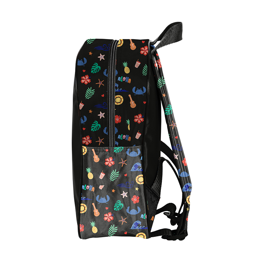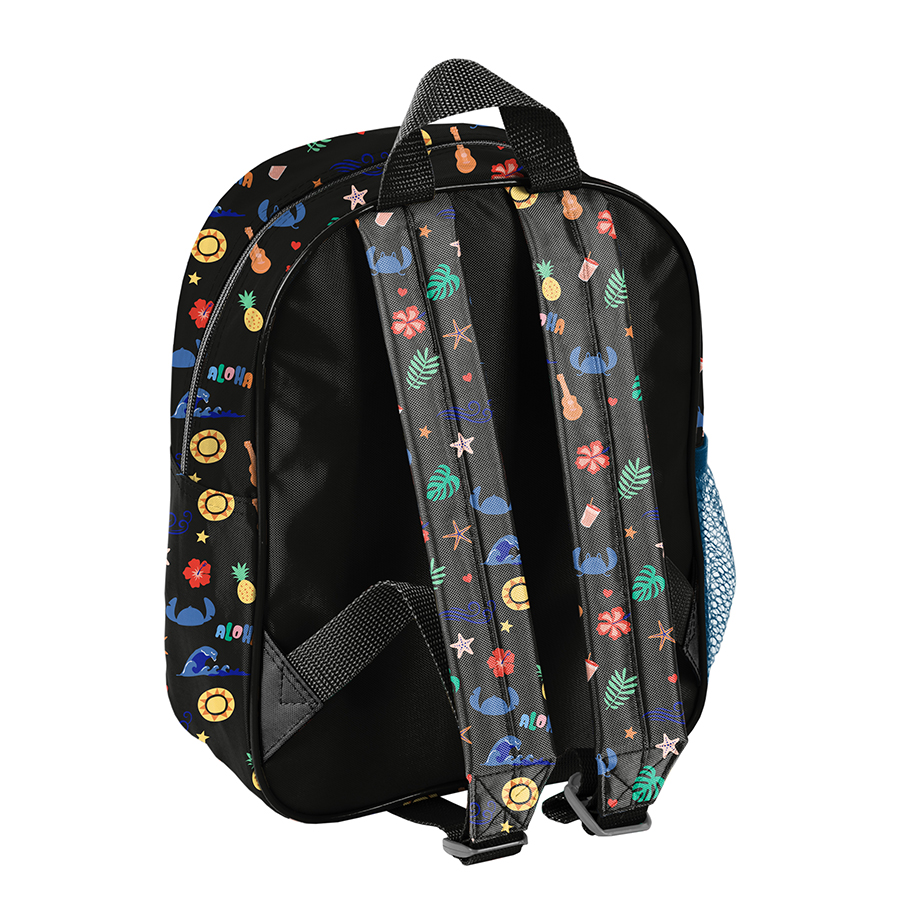 Mały plecak przedszkolny Stitch. Posiada jedną komorę oraz boczną kieszonkę wykonaną z siatki, w której można przechować małą butelkę lub bidon. Plecak wyposażony jest w regulowane szelki, dzięki którym można idealnie dostosować plecak do wzrostu dziecka. Plecak ma wygodny uchwyt do przenoszenia oraz ozdobne pullery. Idealnie sprawdzi się w czasie szkolnych wycieczek, zajęć pozalekcyjne czy do przedszkola.