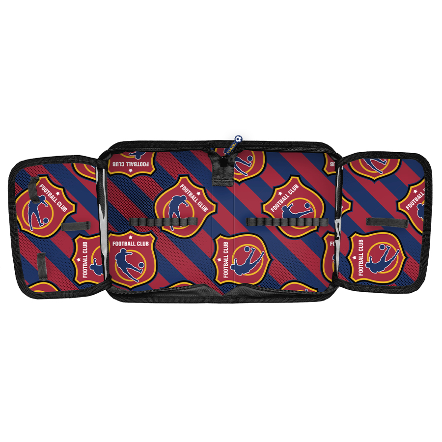 Piórnik bez wyposażenia Football Club Stripes. Uniwersalny, jednokomorowy model z dwiema klapkami na przybory, zapinany na zamek błyskawiczny. Piórnik bez trudu pomieści najważniejsze szkolne akcesoria, a znajdujące się wewnątrz uchwyty pozwolą zachować idealny porządek wśród przyborów. Dzięki swoim idealnym wymiarom nie zajmuje dużo miejsca w plecaku szkolnym.