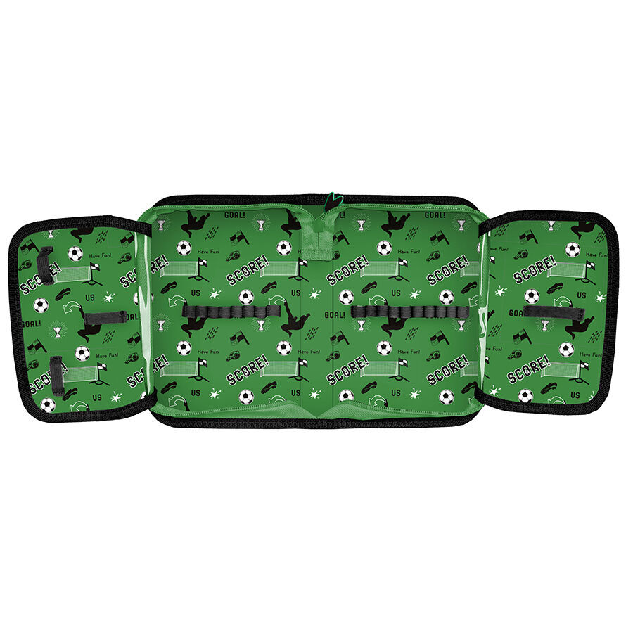 Piórnik bez wyposażenia Football score o motywie piłki. Jest to uniwersalny model jednokomorowy, wyposażony w dwie klapki na przybory, zamykany na zamek błyskawiczny. Piórnik bez trudu pomieści najważniejsze akcesoria szkolne, a znajdujące się wewnątrz uchwyty umożliwiają zachowanie idealnego porządku wśród przyborów. Dzięki odpowiednim wymiarom nie zajmuje on dużo miejsca w plecaku szkolnym.