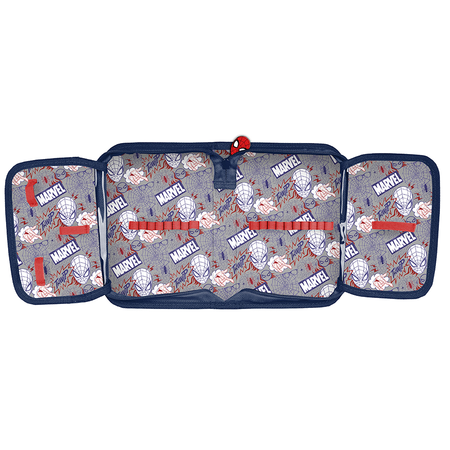 Piórnik bez wyposażenia Spider-Man. Uniwersalny, jednokomorowy model z dwiema klapkami na przybory, zapinany na zamek błyskawiczny. Piórnik bez trudu pomieści najważniejsze szkolne akcesoria, a znajdujące się wewnątrz uchwyty pozwolą zachować idealny porządek wśród przyborów. Dzięki swoim idealnym wymiarom nie zajmuje dużo miejsca w plecaku szkolnym.