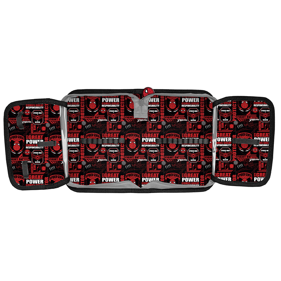 Piórnik bez wyposażenia Spider-Man. Uniwersalny, jednokomorowy model z dwiema klapkami na przybory, zapinany na zamek błyskawiczny. Piórnik bez trudu pomieści najważniejsze szkolne akcesoria, a znajdujące się wewnątrz uchwyty pozwolą zachować idealny porządek wśród przyborów. Dzięki swoim idealnym wymiarom nie zajmuje dużo miejsca w plecaku szkolnym.