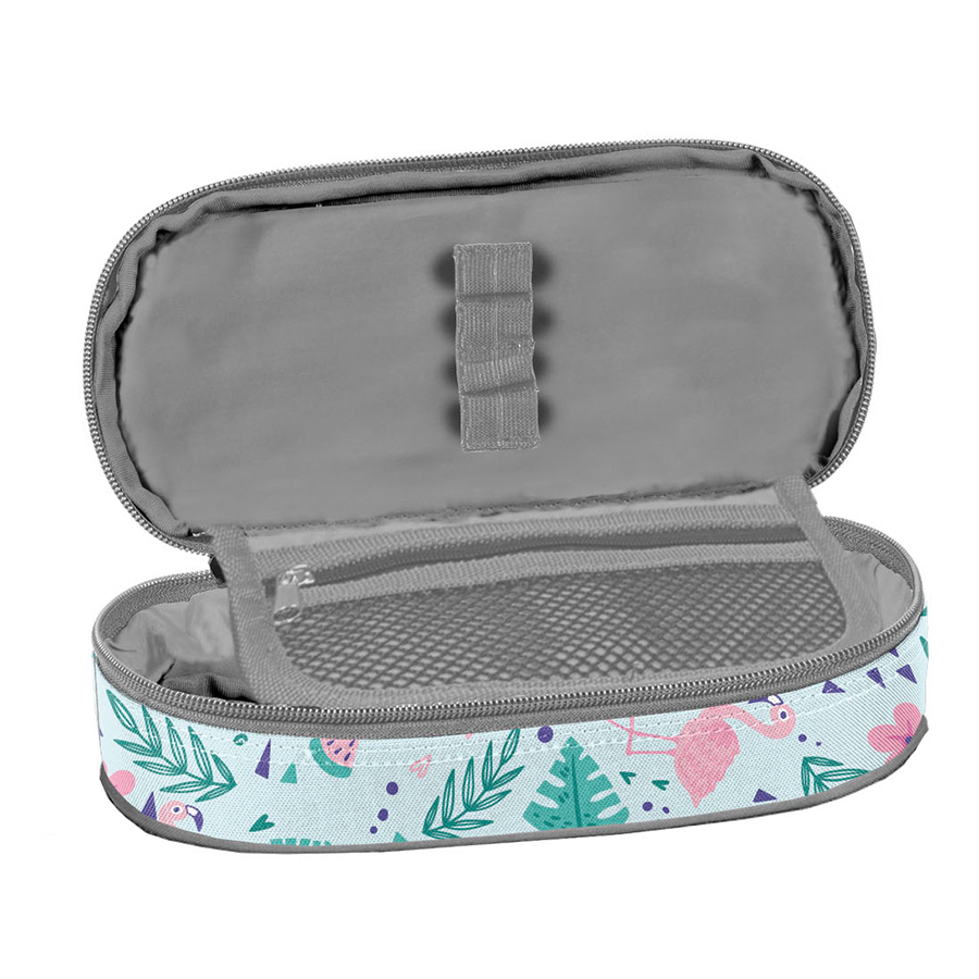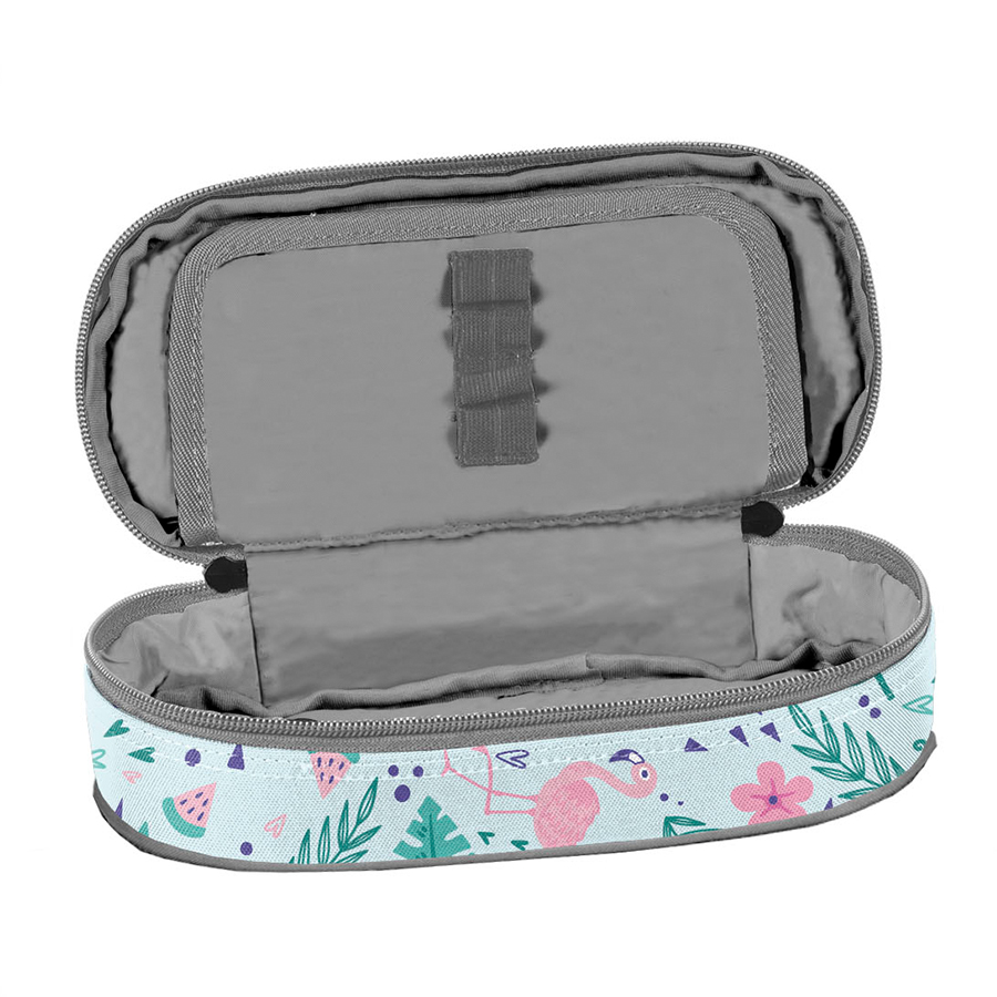Piórnik Flamingo to bardzo praktyczny, jednokomorowy produkt, który z łatwością pomieści wszystkie potrzebne przybory szkolne. W środku znajduje się klapka z dwoma funkcjonalnymi rozwiązaniami: z jednej strony umieszczono miejsca na ołówki, długopisy oraz inne akcesoria do pisania, a z drugiej – praktyczna kieszonka na zamek z siatki. To świetna opcja dla klasycznych piórników, które zazwyczaj nie oferują dostatecznej przestrzeni na dodatkowe akcesoria, takie jak temperówki, kleje, cyrkle, korektory czy markery. W Paso staramy się, aby nasze produkty były nie tylko funkcjonalne, ale także wszechstronne. Z tym piórnikiem wszystko zawsze będzie miało swoje miejsce.