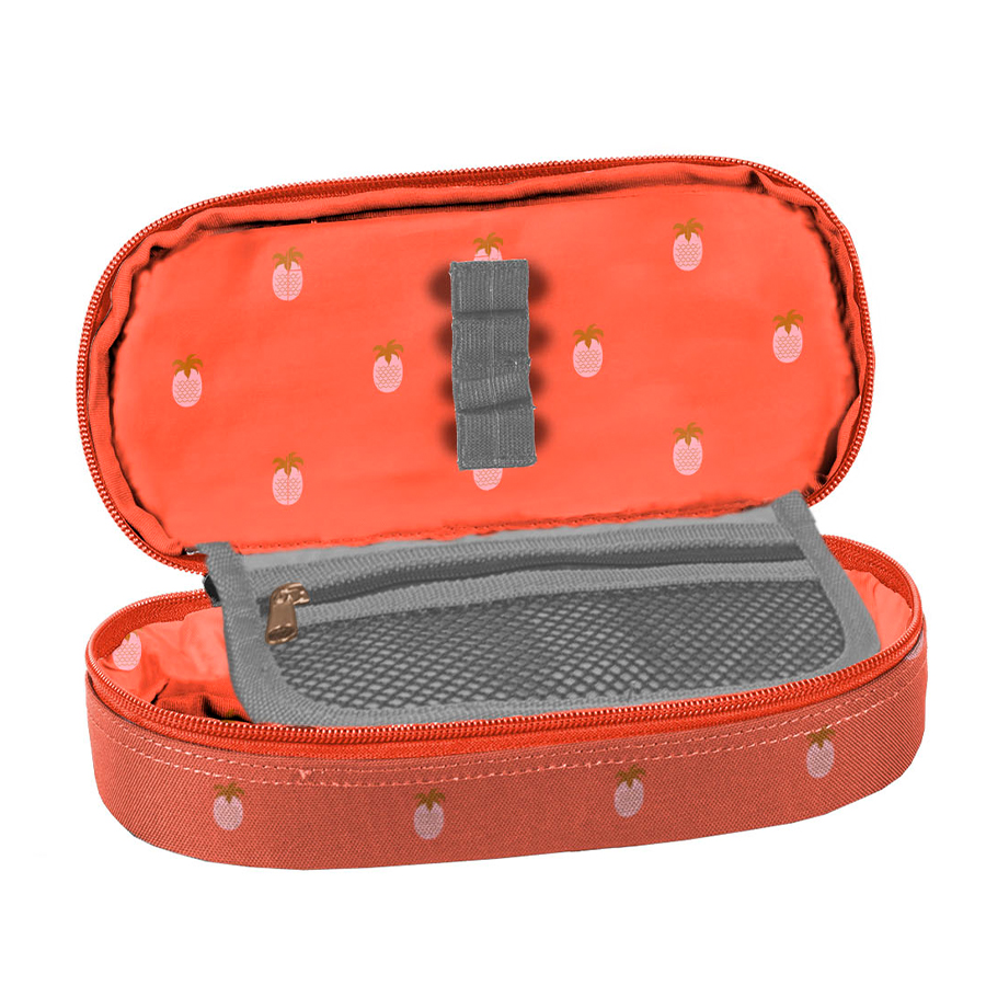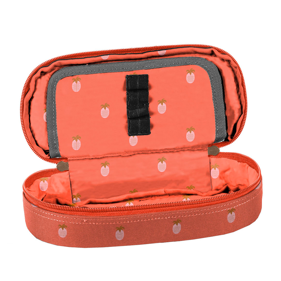 Piórnik Pineapple to bardzo praktyczny, jednokomorowy produkt, który z łatwością pomieści wszystkie potrzebne przybory szkolne. W środku znajduje się klapka z dwoma funkcjonalnymi rozwiązaniami: z jednej strony umieszczono miejsca na ołówki, długopisy oraz inne akcesoria do pisania, a z drugiej – praktyczna kieszonka na zamek z siatki. To świetna opcja dla klasycznych piórników, które zazwyczaj nie oferują dostatecznej przestrzeni na dodatkowe akcesoria, takie jak temperówki, kleje, cyrkle, korektory czy markery. W Paso staramy się, aby nasze produkty były nie tylko funkcjonalne, ale także wszechstronne. Z tym piórnikiem wszystko zawsze będzie miało swoje miejsce.