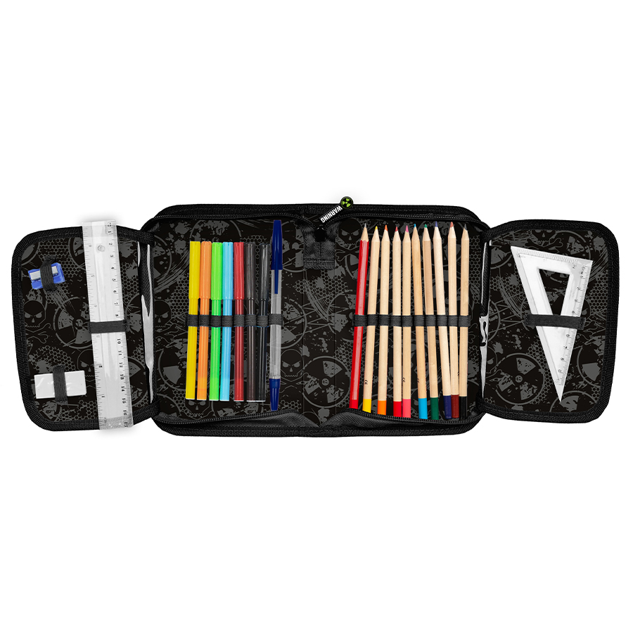 Piórnik z motywem Alert to świetny wybór dla młodych fanów nauki. Ten uniwersalny, jednokomorowy model posiada dwie klapki na akcesoria i zamykany jest na niezawodny suwak. Z łatwością zmieści wszystkie potrzebne artykuły szkolne. W komplecie znajdują się długopis, ołówek, siedem flamastrów, dziewięć kredek, gumka, linijka, temperówka oraz ekierka. Wbudowane uchwyty w piórniku wspierają zachowanie doskonałego porządku oraz zapewniają wygodę w użytkowaniu.