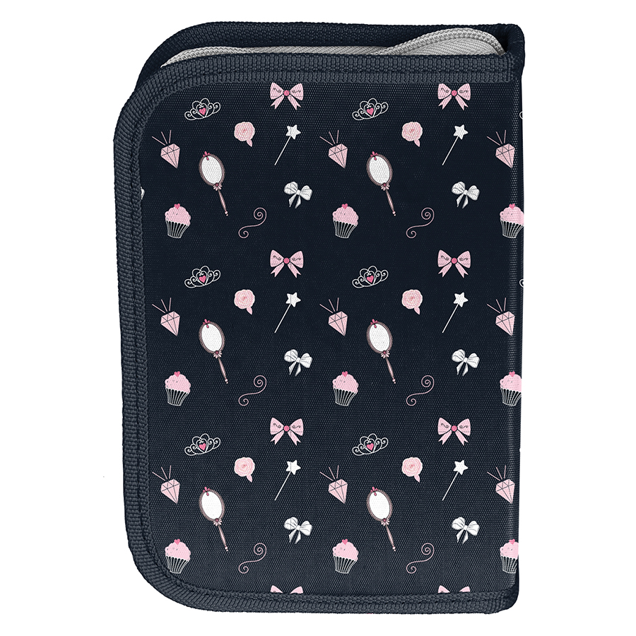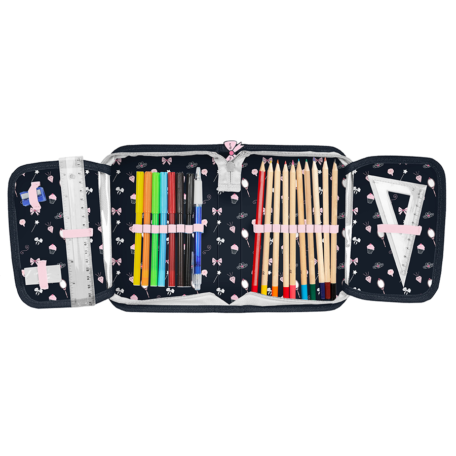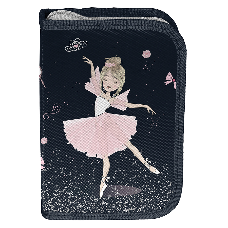Piórnik z wyposażeniem Baletnica. Uniwersalny, jednokomorowy model z dwiema klapkami na przybory, zapinany na zamek błyskawiczny. Piórnik bez trudu pomieści najważniejsze szkolne akcesoria. Wzbogacony o wyposażenie w postaci przyborów takich jak (długopis, ołówek, 7 pisaków, 9 kredek, gumka, linijka, temperówka, ekierka). Znajdujące się wewnątrz uchwyty pozwalają zachować idealny porządek.