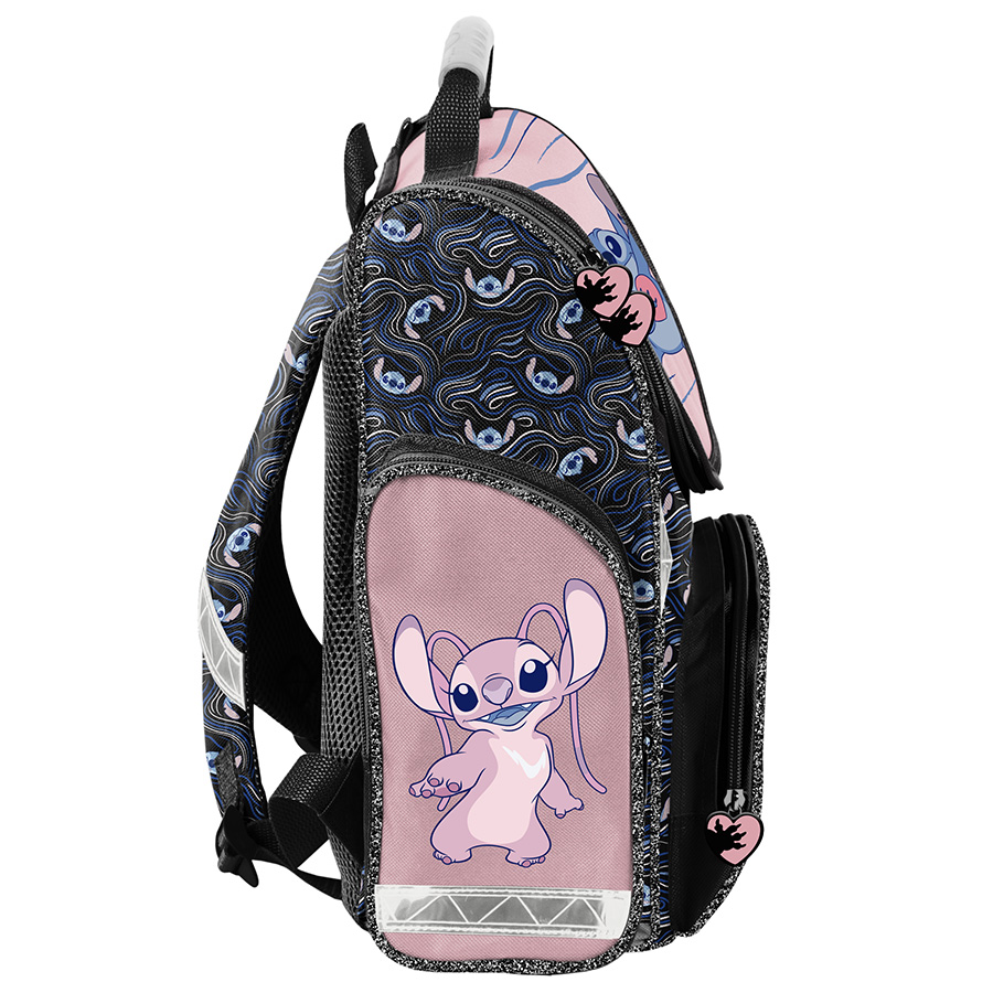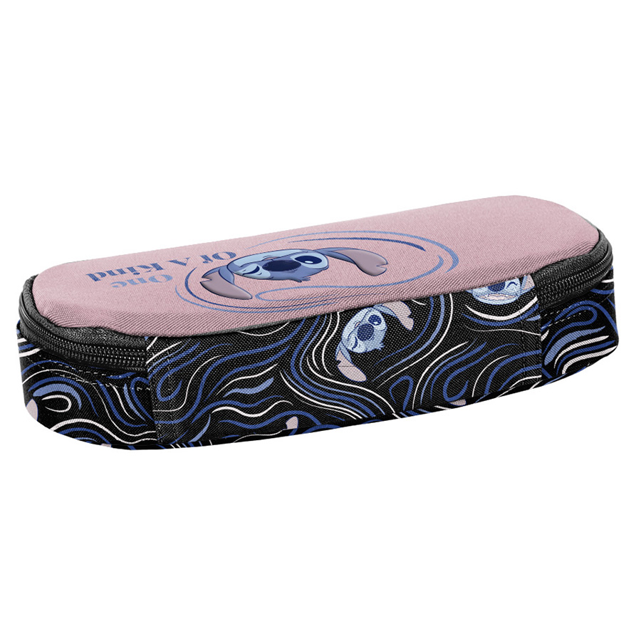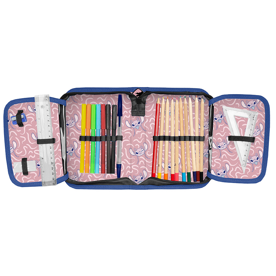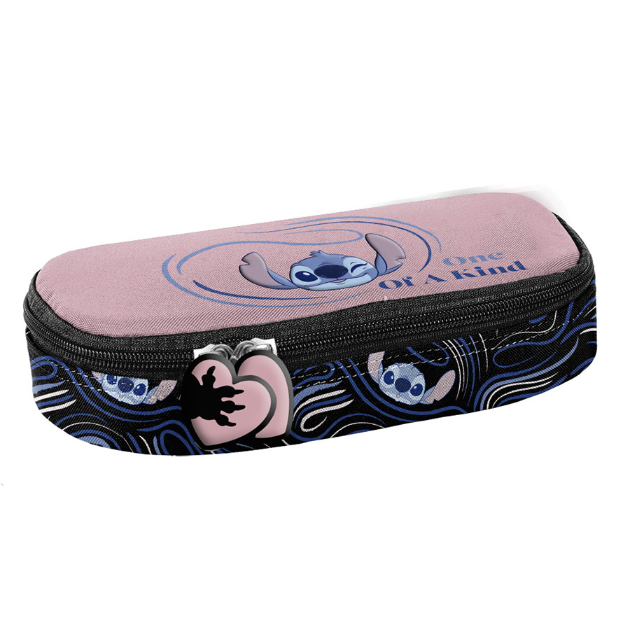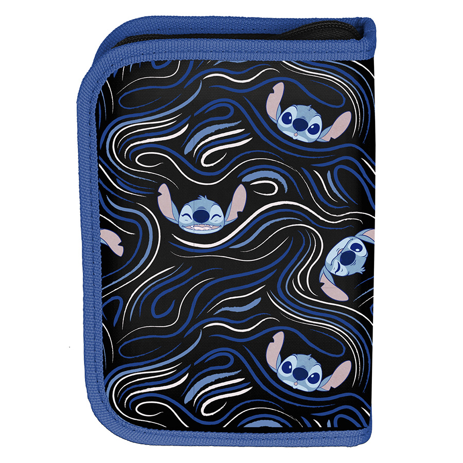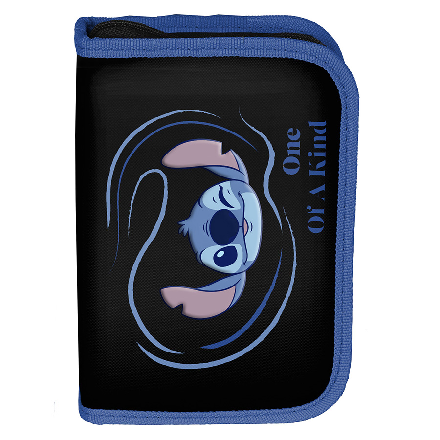Piórnik z wyposażeniem One of a kind Stitch. Uniwersalny, jednokomorowy model z dwiema klapkami na przybory, zapinany na zamek błyskawiczny. Piórnik bez trudu pomieści najważniejsze szkolne akcesoria. Wzbogacony o wyposażenie w postaci przyborów takich jak (długopis, ołówek, 7 pisaków, 9 kredek, gumka, linijka, temperówka, ekierka). Znajdujące się wewnątrz uchwyty pozwalają zachować idealny porządek.