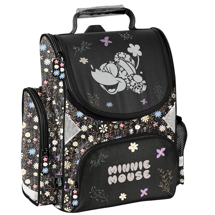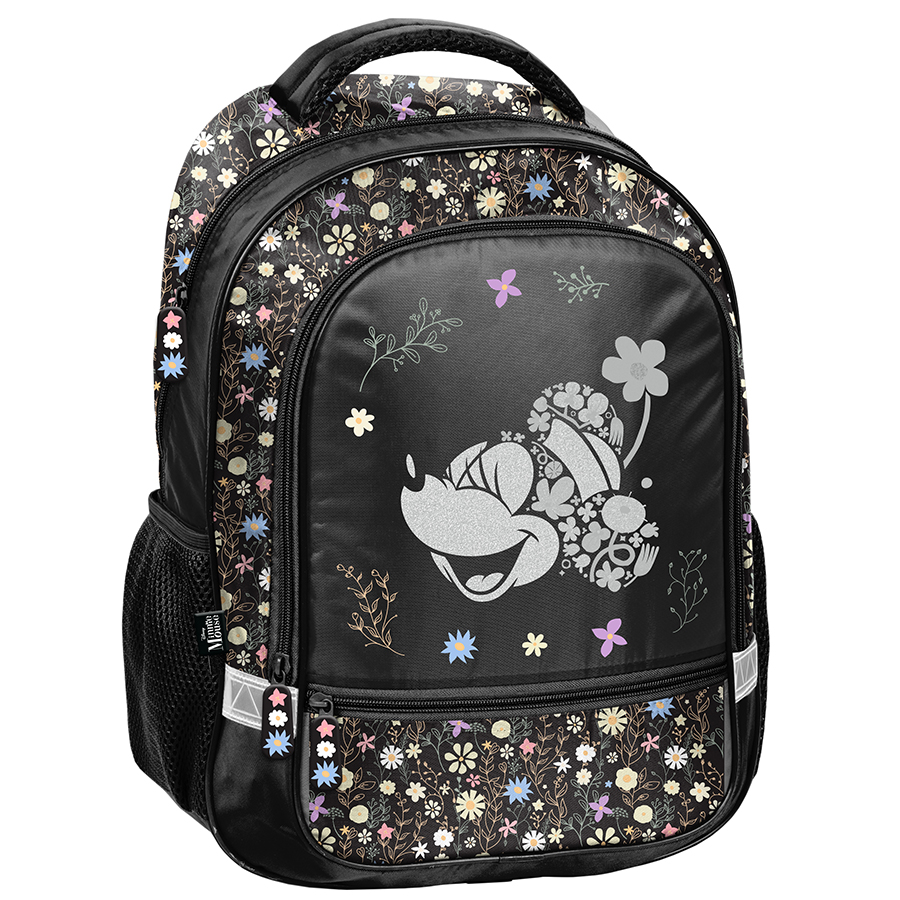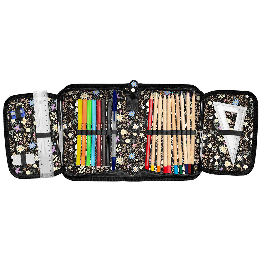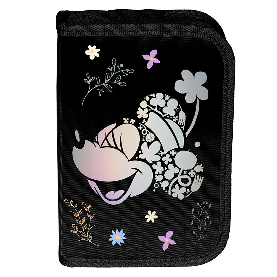 Piórnik z motywem Flowers Myszka Minnie to uniwersalny, jednokomorowy model, który wyposażony jest w dwie klapki na przybory i zapinany jest na zamek błyskawiczny. Dzięki swojej pojemności z łatwością pomieści najważniejsze akcesoria szkolne. W zestawie znajdują się takie przybory jak długopis, ołówek, siedem pisaków, dziewięć kredek, gumka, linijka, temperówka oraz ekierka. Wnętrze piórnika zostało zaprojektowane z myślą o utrzymaniu idealnego porządku, dzięki praktycznym uchwytom.