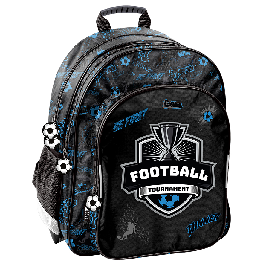 Piórnik z wyposażeniem Football. Uniwersalny, jednokomorowy model z dwiema klapkami na przybory, zapinany na zamek błyskawiczny. Piórnik bez trudu pomieści najważniejsze szkolne akcesoria. Wzbogacony o wyposażenie w postaci przyborów takich jak (długopis, ołówek, 7 pisaków, 9 kredek, gumka, linijka, temperówka, ekierka). Znajdujące się wewnątrz uchwyty pozwalają zachować idealny porządek.