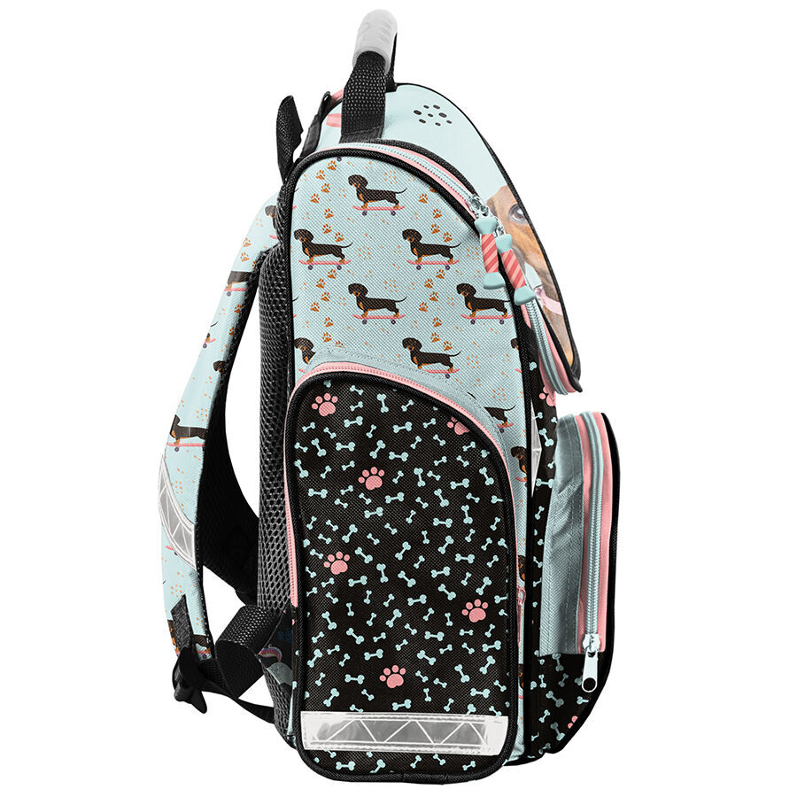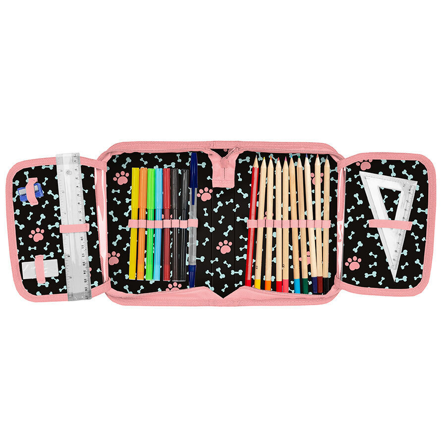 Piórnik z wyposażeniem w motywach Little dog jest produktem o uniwersalnym zastosowaniu, charakteryzującym się jednokomorową konstrukcją oraz dwiema klapkami na przybory, zamykany na zamek błyskawiczny. Model ten z powodzeniem pomieści najważniejsze akcesoria szkolne. Dodatkowo, został wzbogacony o zestaw przyborów, w tym długopis, ołówek, siedem pisaków, dziewięć kredek, gumkę, linijkę, temperówkę oraz ekierkę. Wewnątrz piórnika znajdują się uchwyty, które umożliwiają zachowanie należytego porządku.