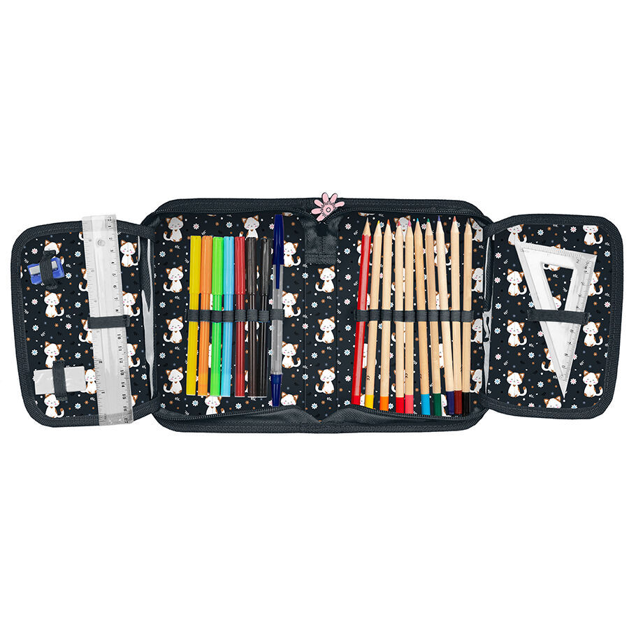 Piórnik z wyposażeniem w motywach Little white cat jest produktem o uniwersalnym zastosowaniu, charakteryzującym się jednokomorową konstrukcją oraz dwiema klapkami na przybory, zamykany na zamek błyskawiczny. Model ten z powodzeniem pomieści najważniejsze akcesoria szkolne. Dodatkowo, został wzbogacony o zestaw przyborów, w tym długopis, ołówek, siedem pisaków, dziewięć kredek, gumkę, linijkę, temperówkę oraz ekierkę. Wewnątrz piórnika znajdują się uchwyty, które umożliwiają zachowanie należytego porządku.