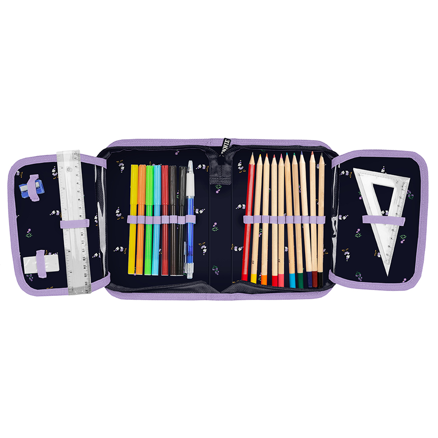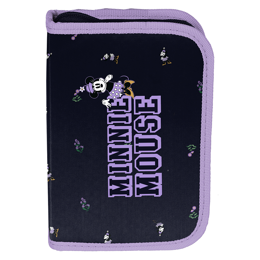 Piórnik z wyposażeniem Minnie. Uniwersalny, jednokomorowy model z dwiema klapkami na przybory, zapinany na zamek błyskawiczny. Piórnik bez trudu pomieści najważniejsze szkolne akcesoria. Wzbogacony o wyposażenie w postaci przyborów takich jak (długopis, ołówek, 7 pisaków, 9 kredek, gumka, linijka, temperówka, ekierka). Znajdujące się wewnątrz uchwyty pozwalają zachować idealny porządek.