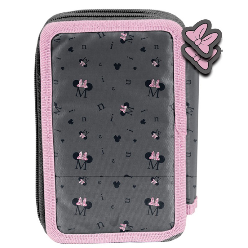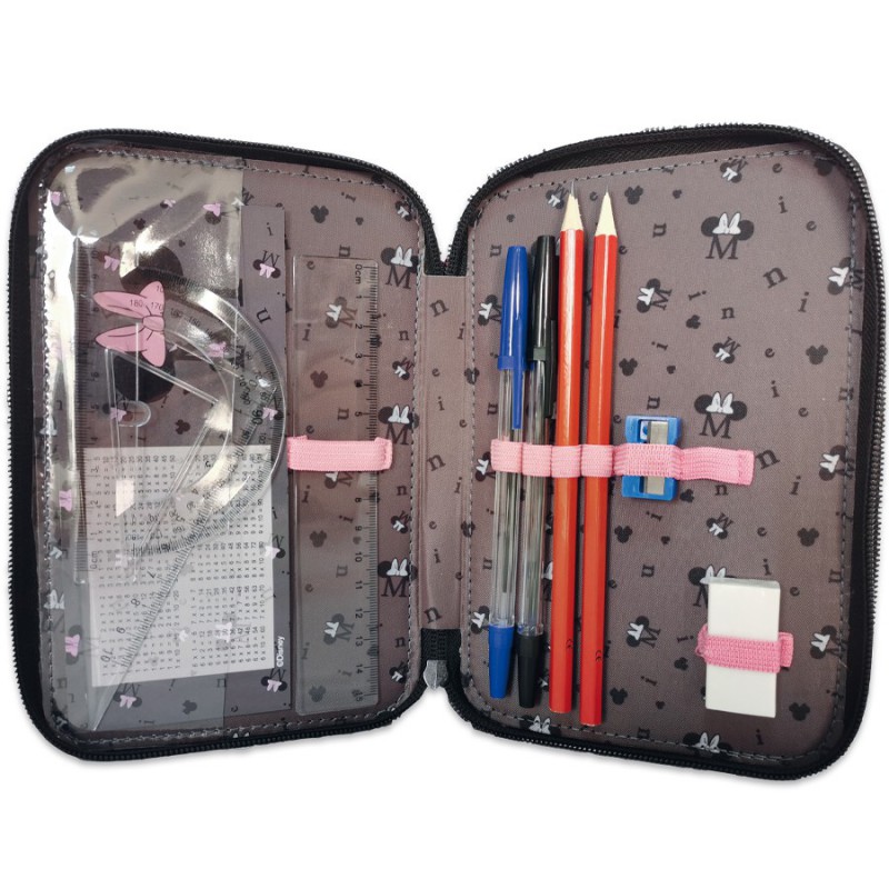 Piórnik z wyposażeniem Minnie. Uniwersalny, trzykomorowy model z przyborami, zapinany na zamek błyskawiczny. Piórnik bez trudu pomieści najważniejsze szkolne akcesoria. Wzbogacony o wyposażenie w postaci przyborów takich jak (długopis, 2 ołówki, 9 pisaków, 9 kredek, gumka, linijka, temperówka, ekierka, plan lekcji). Znajdujące się wewnątrz uchwyty pozwalają zachować idealny porządek.