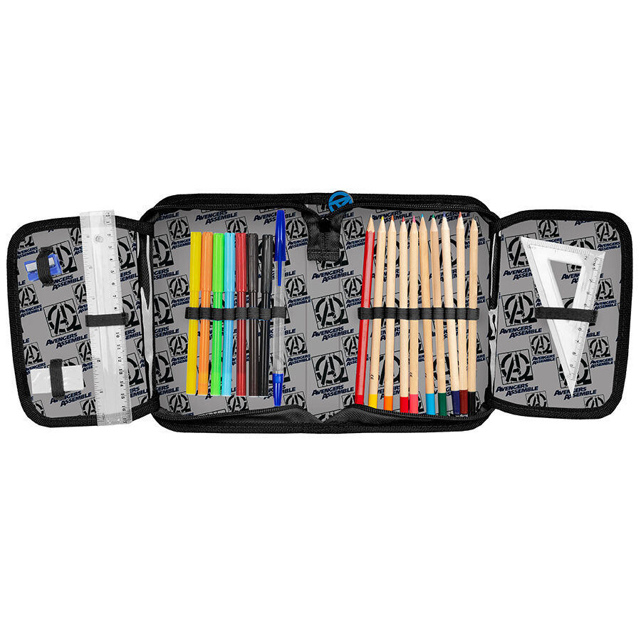 Piórnik z wyposażeniem Power Avengers. Uniwersalny, jednokomorowy model z dwiema klapkami na przybory, zapinany na zamek błyskawiczny. Piórnik bez trudu pomieści najważniejsze szkolne akcesoria. Wzbogacony o wyposażenie w postaci przyborów takich jak (długopis, ołówek, 7 pisaków, 9 kredek, gumka, linijka, temperówka, ekierka). Znajdujące się wewnątrz uchwyty pozwalają zachować idealny porządek.