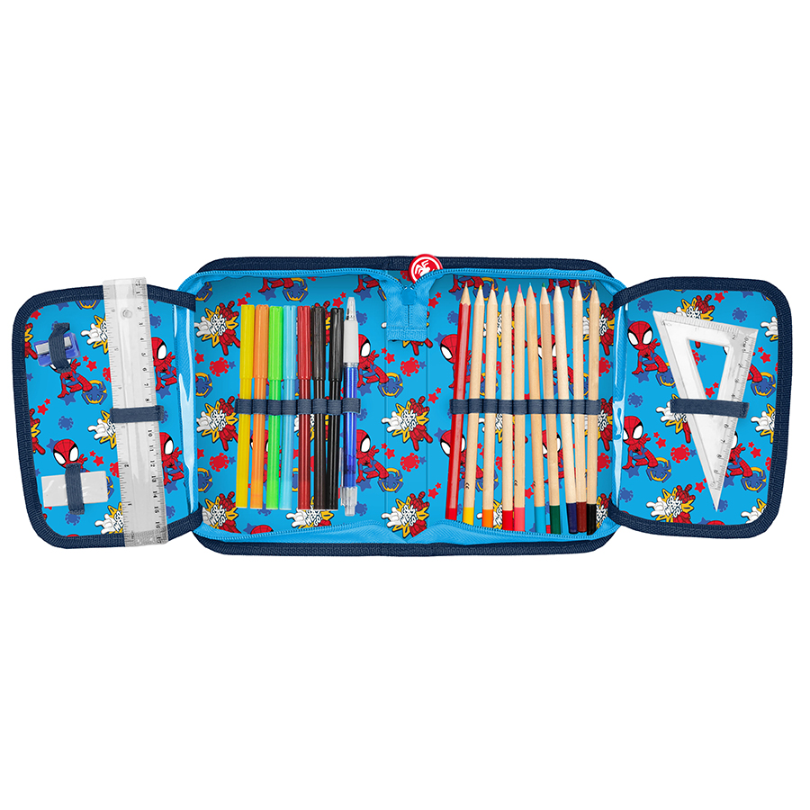 Piórnik z wyposażeniem Spidey. Uniwersalny, jednokomorowy model z dwiema klapkami na przybory, zapinany na zamek błyskawiczny. Piórnik bez trudu pomieści najważniejsze szkolne akcesoria. Wzbogacony o wyposażenie w postaci przyborów takich jak (długopis, ołówek, 7 pisaków, 9 kredek, gumka, linijka, temperówka, ekierka). Znajdujące się wewnątrz uchwyty pozwalają zachować idealny porządek.