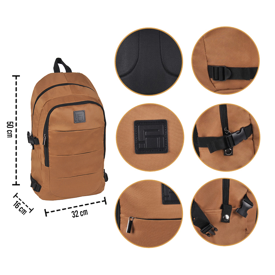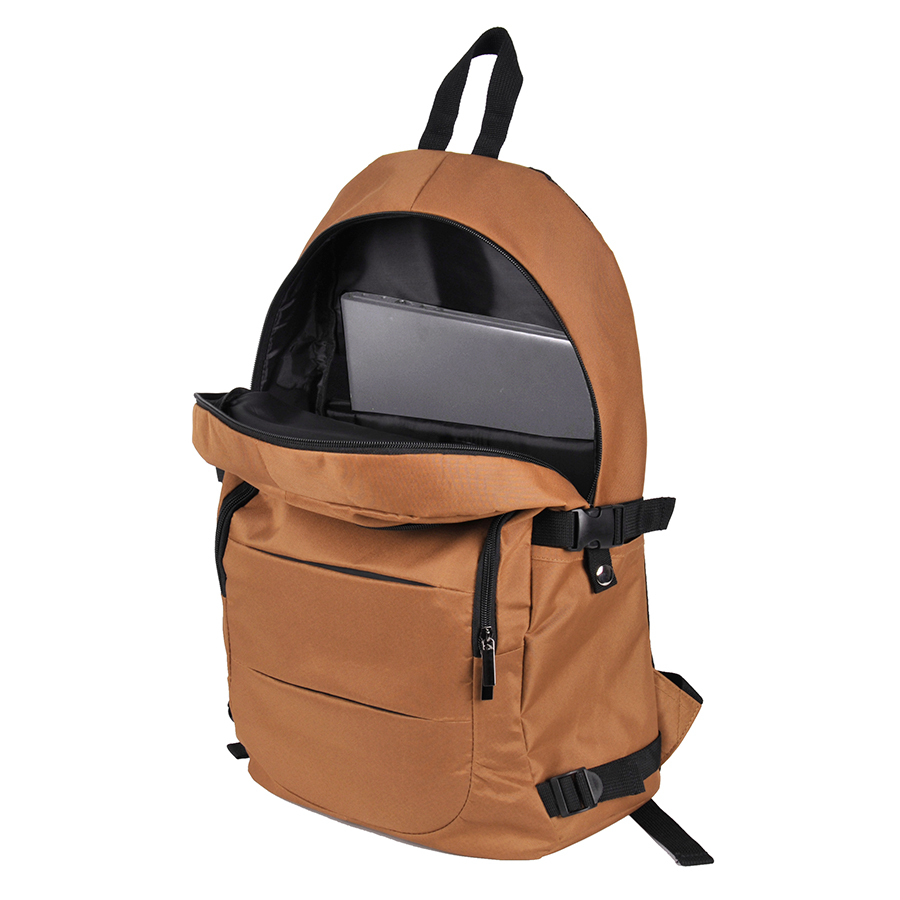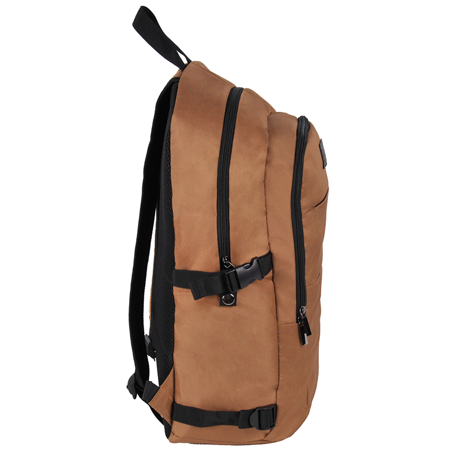 Plecak biznesowy na laptop. Idealnie sprawdzi się w czasie podróży służbowej lub wyjazdu weekendowego. Wyposażony jest w pojemną komorę główną z kieszenią na laptop oraz drugą mniejszą komorę. Obie zamykane na zamek dwukierunkowy dla łatwiejszego dostępu do wnetrza. Ukryta przednia kieszeń do przechowania telefonu, portfela, kluczy czy innych drobiazgów. Wzmocnione plecy oraz szelki z mozliwością regulacji, pokryte siatką podnoszą komfort noszenia. Plecak posiada wygodny uchwyt do przenoszenia w dłoni lub zawieszenia. Boczne pasy ściągające zapewniają dodatkowe miejsce pakowe dla kurtki, karimaty lub innego wyposażenia. Dwie funkcjonalne kieszenie boczne zapinane na zatrzaski, idealnie nadają się do przenoszenia butelki, bidonu lub termosu. Wzmocniony spód zapewnia stabilność konstrukcji. Klasyczny fason i stonowana kolorystyka idealnie podkreśla biznesowy styl plecaka.