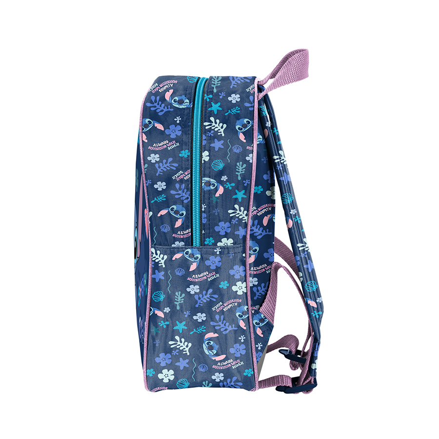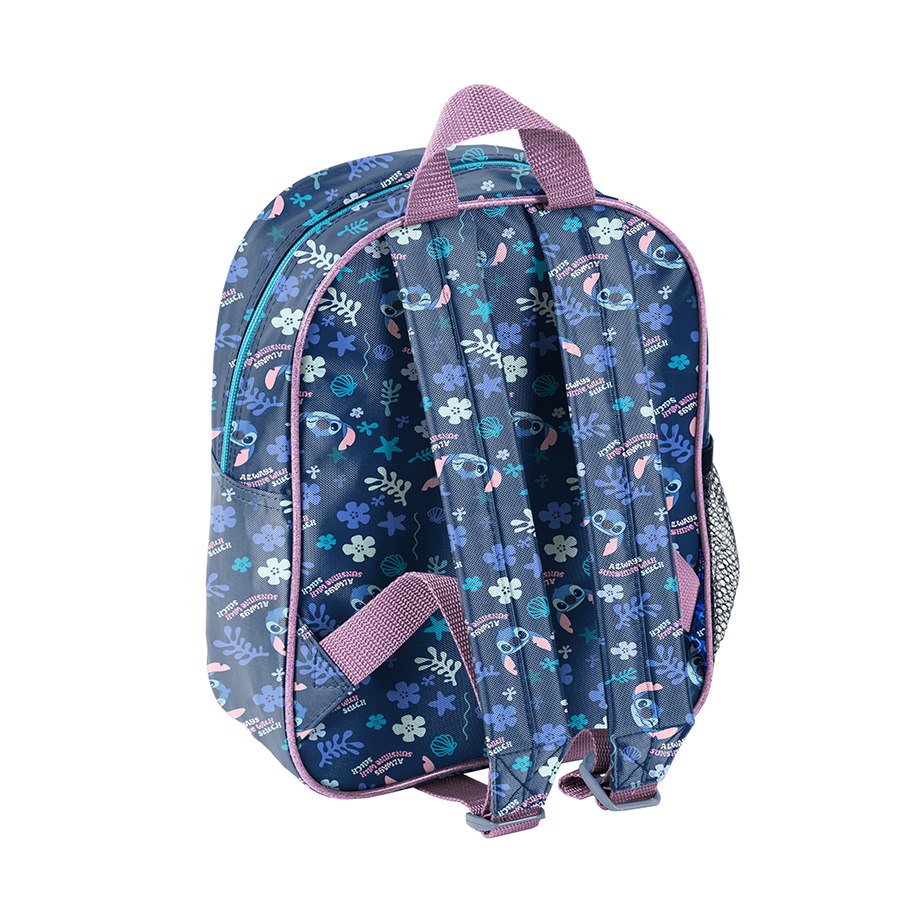 Mały plecak przedszkolny Stitch – Coastal Cool z wizerunkiem Stitcha, posiadający efekt trójwymiarowy. Plecak ten ma jedną dużą komorę, którą można zamknąć za pomocą zamka błyskawicznego, oraz boczną kieszeń z siatki, służącą do trzymania drobnych akcesoriów. Plecak zawiera również miękkie, regulowane szelki, które pozwalają na doskonałe dostosowanie modelu do wzrostu dziecka. Ponadto, plecak jest wyposażony w wygodny uchwyt do noszenia w ręce lub zawieszenia. Dekoracyjny zamek przy komorze ułatwia jej zamykanie oraz zwiększa ogólną estetykę produktu. To jest znakomity wybór dla małych dzieci, doskonały na wycieczki szkolne, zajęcia pozalekcyjne oraz do przedszkola.