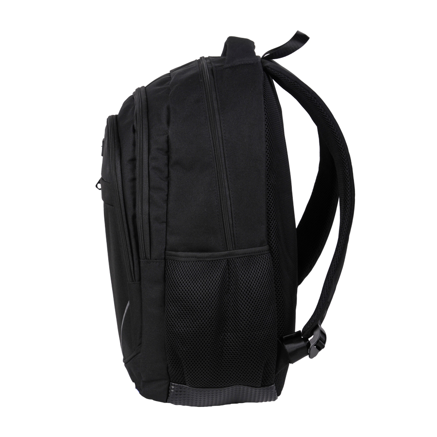 Plecak biznesowy czarny Paso. Zbudowany z trzech komór zamykanych na zamek. W komorze głównej znajduje się funkcjonalna przegroda zapewniająca porządek wśród zapakowanych przedmiotów. Na froncie umieszczono pojemną kieszeń zamykaną na zamek idealną na dodatkowe akcesoria. Dwie boczne kieszenie z siatki nadają się do przechowywania bidonu, butelki lub termosu. Profilowane plecy pokryte siatką oraz regulowane szelki zapewnią komfort noszenia. Wzmocniony spód z odpornego na przemakanie materiału zapewnia stabilność oraz ochronę całej konstrukcji. Wygodny uchwyt do przenoszenia oraz ucho do zawieszania zwiększają atrakcyjność modelu. Stonowana kolorystyka idealnie podkreśli biznesowy styl plecaka.