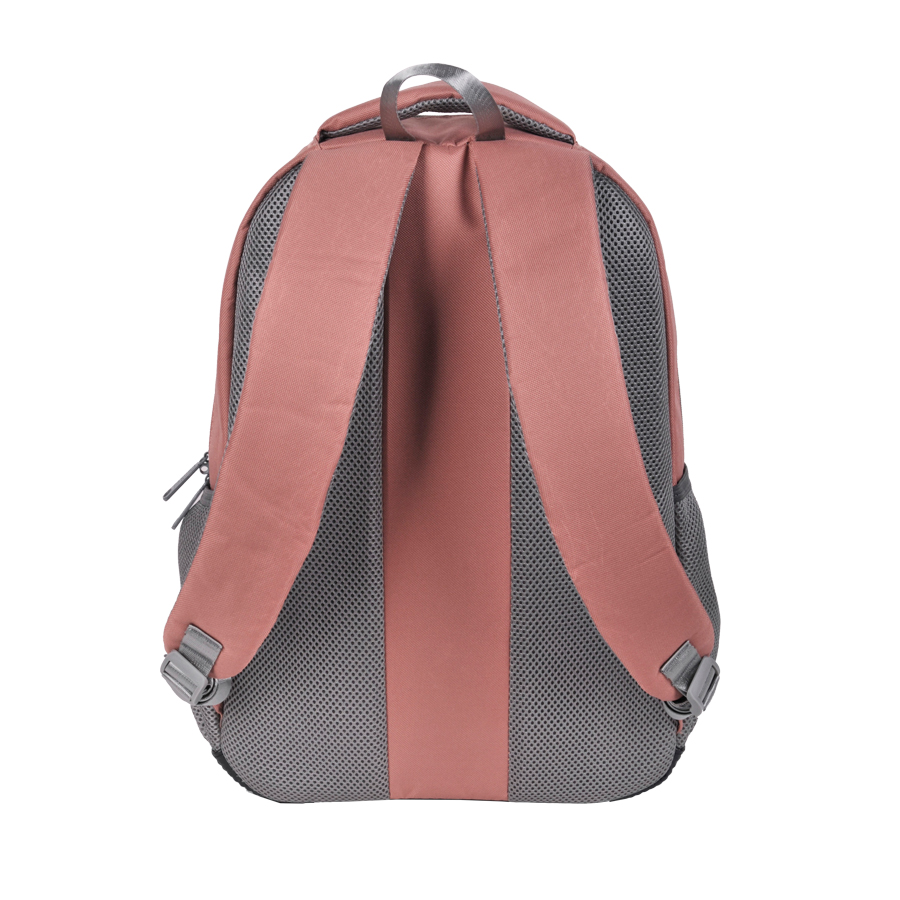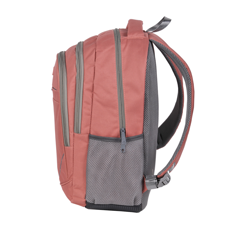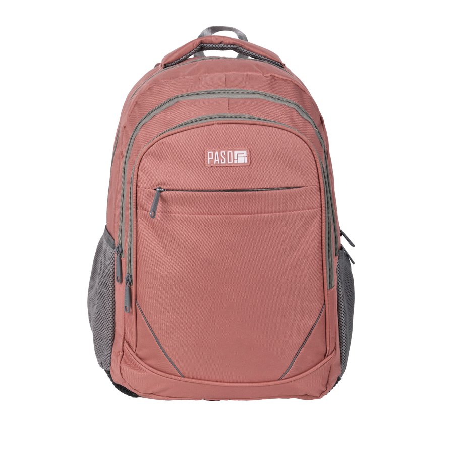 Plecak biznesowy różowy Paso. Zbudowany z trzech komór zamykanych na zamek. W komorze głównej znajduje się funkcjonalna przegroda zapewniająca porządek wśród zapakowanych przedmiotów. Na froncie umieszczono pojemną kieszeń zamykaną na zamek idealną na dodatkowe akcesoria. Dwie boczne kieszenie z siatki nadają się do przechowywania bidonu, butelki lub termosu. Profilowane plecy pokryte siatką oraz regulowane szelki zapewnią komfort noszenia. Wzmocniony spód z odpornego na przemakanie materiału zapewnia stabilność oraz ochronę całej konstrukcji. Wygodny uchwyt do przenoszenia oraz ucho do zawieszania zwiększają atrakcyjność modelu. Stonowana kolorystyka idealnie podkreśli biznesowy styl plecaka.