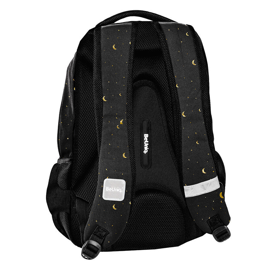 Plecak młodzieżowy Black and gold moon BeUniq to produkt, który cechuje się trzema pojemnymi komorami, a także frontową kieszenią z organizerem, zamykaną na zamek. Dodatkowo wyposażony jest w dwie boczne kieszenie, wykonane z siatki oraz materiału, które umożliwiają przechowanie butelki, bidonu lub termosu. W głównej komorze znajduje się przegroda przeznaczona na laptop. W drugiej komorze umieszczony jest organizer z kieszenią na zamek oraz uchwyt na klucze. Wzmocnione, profilowane plecy oraz miękkie, regulowane szelki zapewniają wyjątkowy komfort noszenia. Plecak wyposażony jest w wygodny uchwyt do przenoszenia oraz uszko umożliwiające zawieszenie go, a także w elementy odblaskowe, co zwiększa bezpieczeństwo użytkownika na drodze po zmroku. Model ten zawiera również usztywniony i wzmocniony spód. Ze względu na swój rozmiar, plecak stanowi idealne rozwiązanie zarówno dla nastolatków, jak i dla młodszych dzieci.