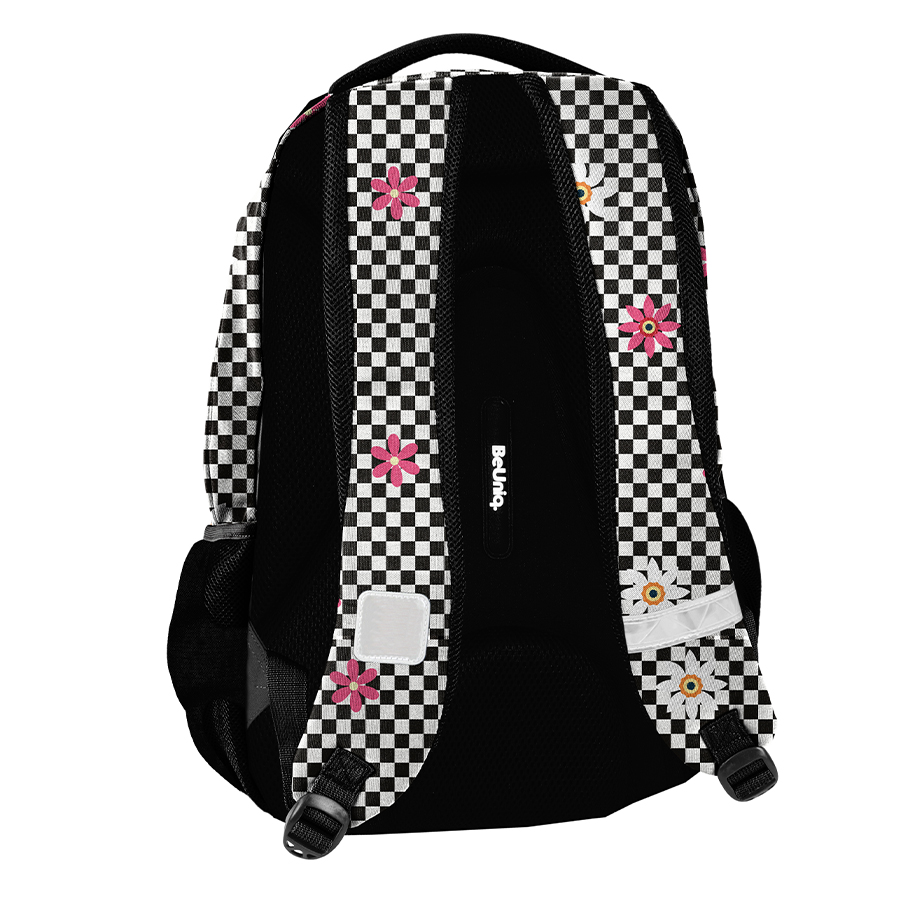 Plecak młodzieżowy Flower BeUniq to doskonały wybór dla każdego młodego człowieka. Posiada aż trzy pojemne komory, w tym przednią kieszeń z organizerem zamykaną na zamek oraz dwie boczne kieszonki z siatki i materiału, które pomieszczą butelkę, bidon czy termos. W głównej komorze znajduje się przegroda, idealna na laptop, natomiast w drugiej komorze znajdziesz organizer z kieszenią na zamek oraz uchwyt na klucze. Wzmocnione, profilowane plecy oraz miękkie, regulowane szelki zapewniają niezwykły komfort noszenia plecaka. Dodatkowo, umieszczony uchwyt ułatwia transport, a uszko do powieszenia zwiększa praktyczność. Elementy odblaskowe gwarantują większe bezpieczeństwo, zwłaszcza po zmroku. Plecak ma usztywniony i wzmocniony spód, co stanowi dodatkowy atut. Dzięki swoim rozmiarom, jest idealnym rozwiązaniem zarówno dla nastolatków, jak i młodszych dzieci.