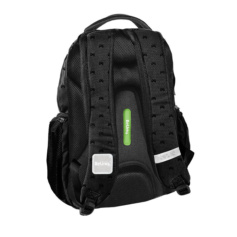 Plecak młodzieżowy Game Pads marki BeUniq charakteryzuje się trzema pojemnymi komorami, a także przednią kieszenią z organizerem, zamykaną na zamek błyskawiczny. Dodatkowo, plecak wyposażony jest w dwie boczne kieszenie, które również zamykane są na zamek. W komorze głównej znajduje się przegroda przeznaczona na laptop, natomiast w drugiej komorze umieszczono organizer z kieszenią na zamek oraz uchwyt na klucze.