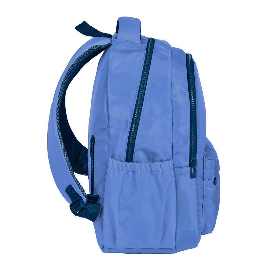 Plecak młodzieżowy BeUniq w kolorze niebieskim charakteryzuje się dwiema funkcjonalnymi komorami, które zamykane są na zamek. Komora główna wyposażona jest w wewnętrzne przegrody, co umożliwia skuteczne utrzymanie porządku. Na przedniej stronie plecaka znajduje się praktyczna kieszeń zamykana na zamek, która pomieści niezbędne drobne akcesoria szkolne. Model ten posiada również dwie boczne kieszonki, które idealnie nadają się do przechowywania bidonu lub butelki z wodą. Miękki, wzmocniony spód oraz regulowane szelki plecaka zwiększają komfort noszenia. Na plecach umieszczona jest dodatkowa, ukryta kieszonka zamykana na zamek, zapewniająca ochronę drobiazgów. Uchwyt górny gwarantuje wygodne przenoszenie plecaka. Całość wykonana jest z lekkiego materiału odpornego na przemakanie, co sprawia, że model ten jest wyjątkowo łatwy do noszenia.