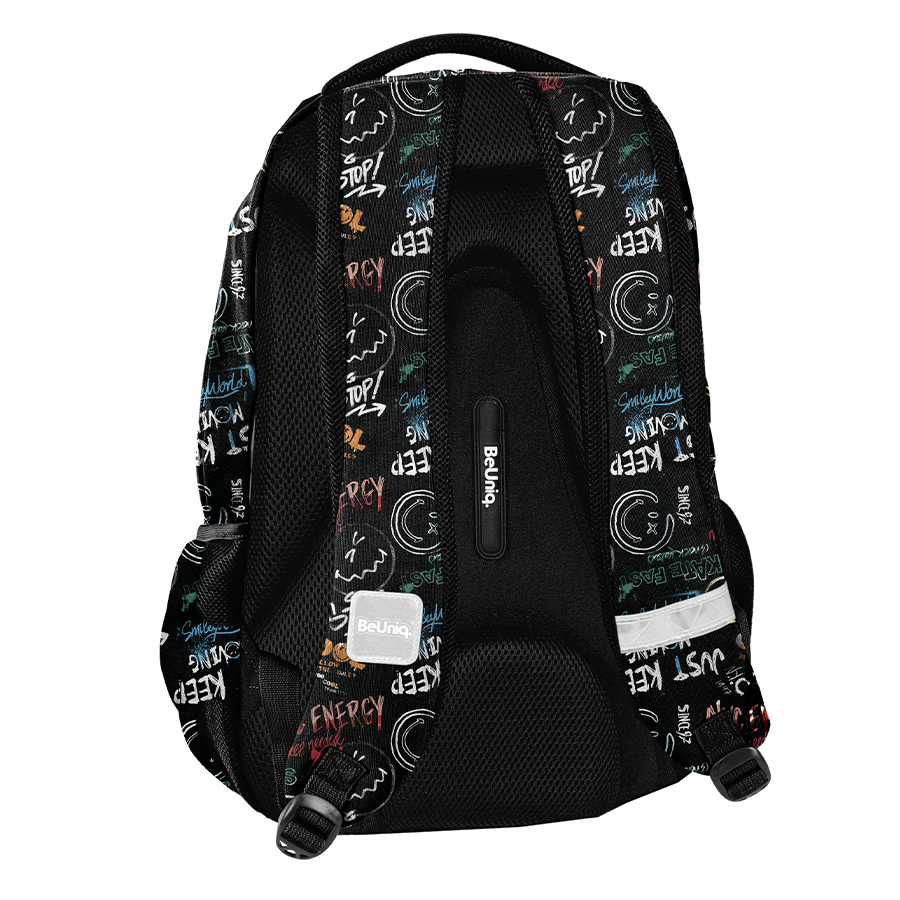 Plecak dla młodzieży Smiley – Energy BeUniq to wspaniały wybór dla każdego nastolatka. Posiada trzy przestronne komory, co ułatwia uporządkowanie rzeczy oraz zapewnia wystarczającą ilość miejsca do przechowywania. Z przodu umieszczono kieszeń z organizerem, zamykaną na zamek, a po bokach znajdują się dwie siatkowe kieszenie, które świetnie nadają się na butelkę, bidon lub inne drobiazgi.