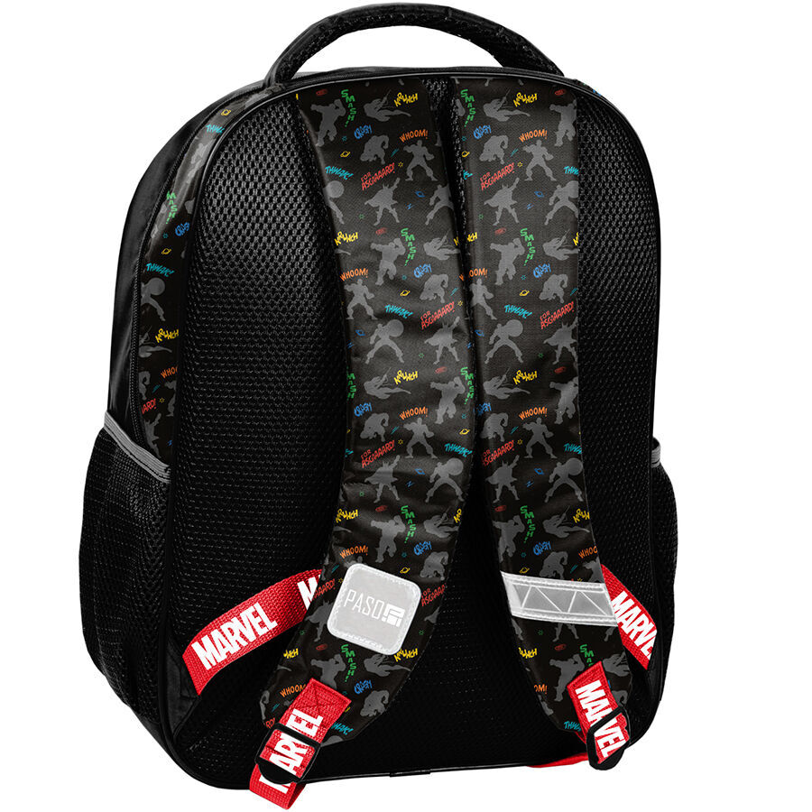 Plecak szkolny Avengers Comics Marvel. Produkt składa się z dwóch dużych komór, kieszeni na froncie oraz z dwóch bocznych kieszonek wykonanych z siatki. W kieszonkach z łatwością pomieści się termos czy bidon. Elementy odblaskowe umieszczone na plecaku sprawiają, że dziecko będzie jeszcze bardziej widoczne, a co za tym idzie – bezpieczne. Usztywniane gąbką, ergonomiczne wyprofilowane plecy oraz regulowane szelki pokryte miękkim materiałem zapewniają dziecku prawidłową postawę i odciążają kręgosłup. Dzięki tym cechom plecak jest bardzo komfortowy, a noszenie podręczników oraz zeszytów jest niezwykle wygodne. Plecak wyposażony jest w wygodny uchwyt do przenoszenia oraz usztywnione i wzmocnione dno. Wygodne ozdobne pullery ułatwiają odpinanie zamków. Plecak uszyty jest z materiału odpornego na przemakanie.