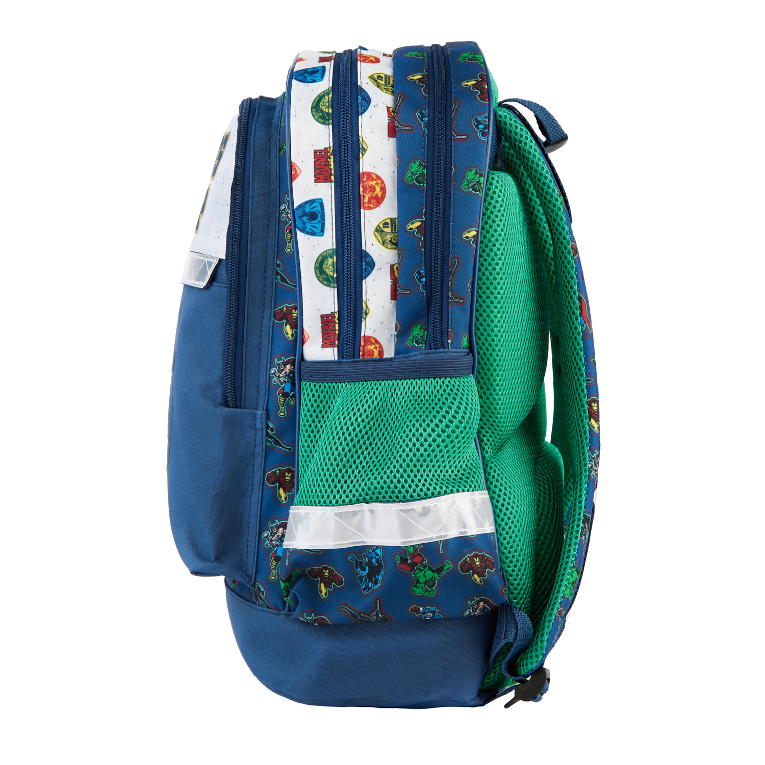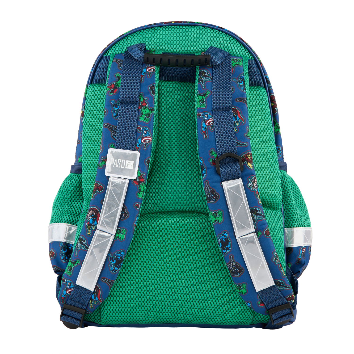 Plecak szkolny Avengers. Plecak posiada dwie pojemne komory oraz dwie duże kieszenie frontowe. Dodatkowo jest wyposażony w dwie boczne kieszonki z siatki, które doskonale nadają się do przechowywania drobniejszych akcesoriów lub butelki z napojem. Usztywnione gąbką, ergonomiczne wyprofilowane plecy oraz regulowane szelki pokryte miękkim materiałem zapewniają dziecku prawidłową postawę i odciążają kręgosłup. Plecak wyposażony jest w usztywnione dno, wzmocnione i zabezpieczone gumowymi stopkami. Na froncie, bokach i z tyłu posiada elementy odblaskowe, które zwiększają bezpieczeństwo. Uszyty jest z materiału odpornego na przemakanie. Idealnie sprawdzi się zarówno w szkole czy na wycieczce.