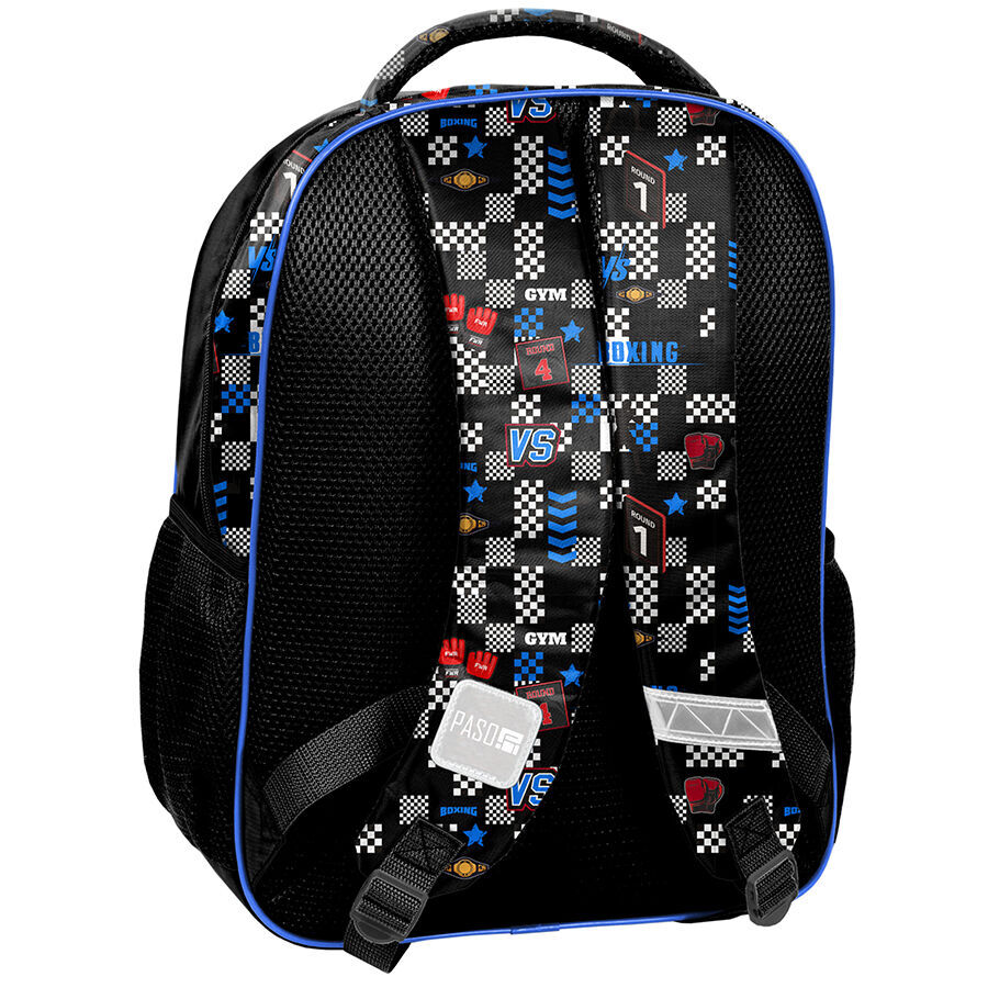 Plecak szkolny Boxing club o tematyce sportowej jest produktem składającym się z dwóch przestronnych komór, przedniej kieszeni oraz dwóch bocznych kieszonek wykonanych z siatki. Kieszonki te umożliwiają wygodne przechowywanie termosu lub bidonu. Elementy odblaskowe umieszczone na plecaku zwiększają widoczność dziecka, co przyczynia się do jego bezpieczeństwa.