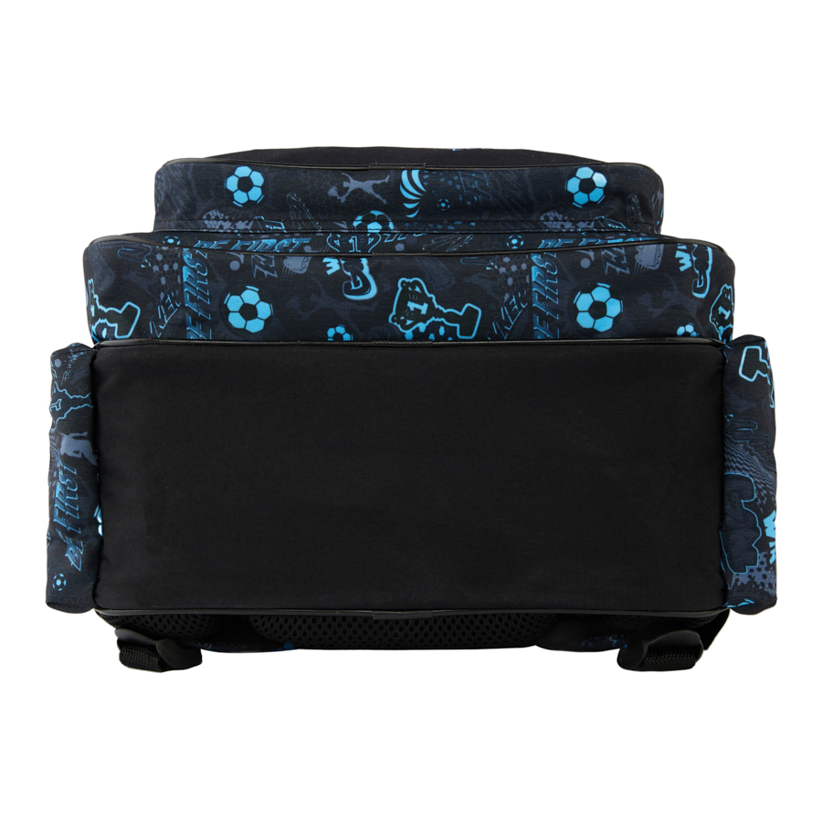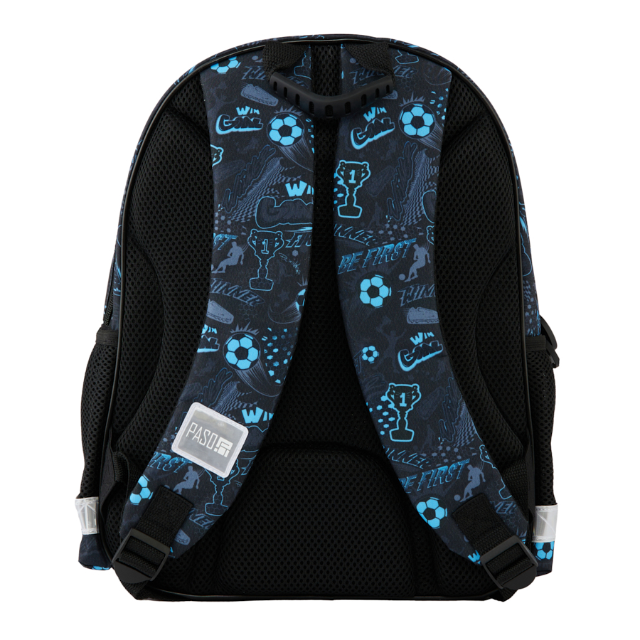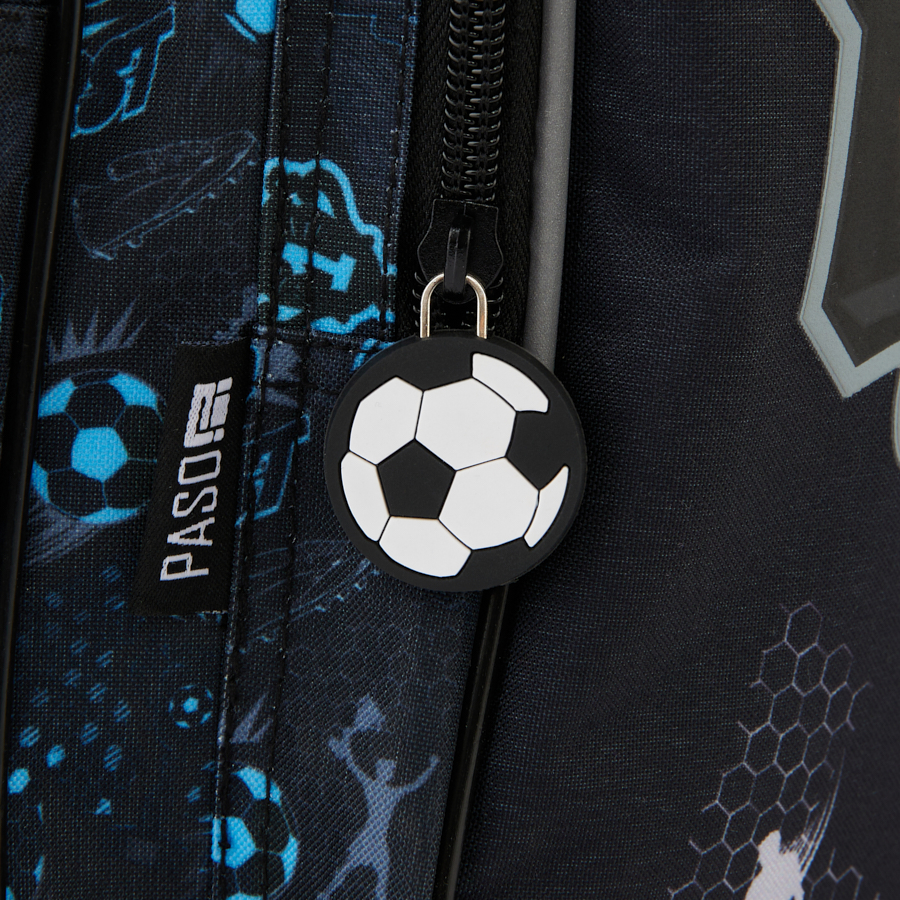 Plecak szkolny Football. Wyposażony jest w dwie duże komory zapinane na zamek oraz jedną bardzo obszerną kieszeń na froncie. Dwie kieszenie z siatki umiejscowione po bokach swobodnie pomieszczą bidon, małą butelkę lub termos. Plecak posiada liczne elementy odblaskowe, dzięki którym dziecko będzie widoczne na drodze. Usztywniane gąbką, ergonomiczne wyprofilowane plecy oraz regulowane szelki pokryte miękkim materiałem zapewniają dziecku prawidłową postawę i odciążają kręgosłup. Dzięki tym cechom plecak jest bardzo komfortowy, a noszenie podręczników oraz zeszytów jest niezwykle wygodne. Plecak uszyty jest z materiału odpornego na przemakanie.