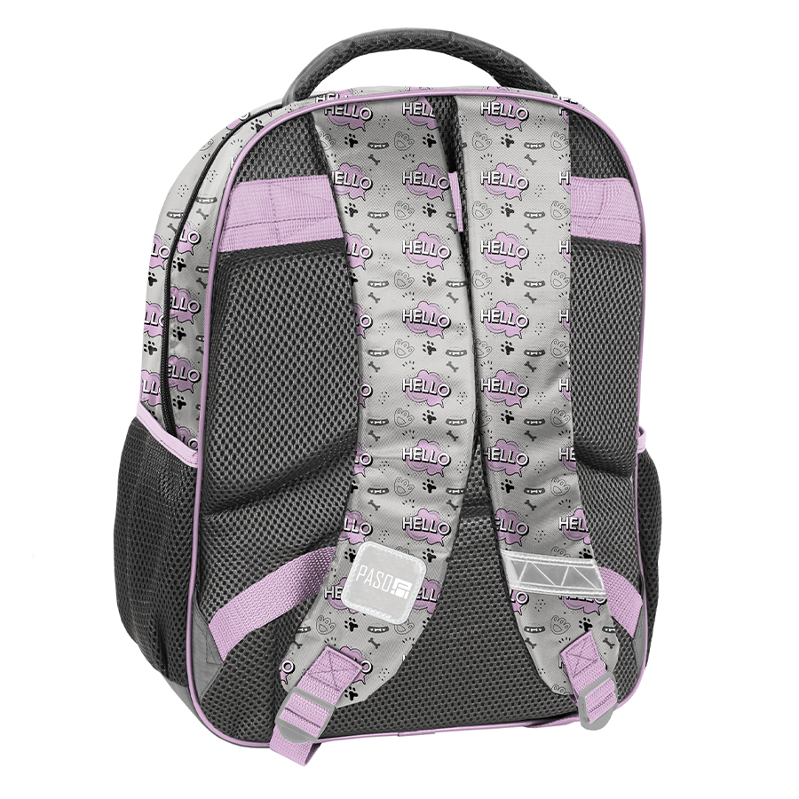 Plecak szkolny Hello Puppie. Ten produkt zawiera dwie obszerne komory, jedną kieszeń z przodu oraz dwie boczne kieszenie wykonane z siatki. W bocznych kieszonkach można łatwo umieścić termos lub bidon. Odblaskowe detale na plecaku sprawiają, że dziecko będzie lepiej widoczne, co zwiększa jego bezpieczeństwo. Plecy plecaka są wzmocnione gąbką i mają ergonomiczny kształt, a szelki są regulowane i pokryte miękkim materiałem, co pomaga w zachowaniu prawidłowej postawy i odciąża kręgosłup. Dzięki tym właściwościom plecak jest bardzo komfortowy, co sprawia, że noszenie książek i zeszytów jest bardzo wygodne. Plecak posiada także praktyczny uchwyt do przenoszenia oraz wzmocnione dno. Ozdobne pullery ułatwiają rozpinanie zamków oraz dodatkowo ozdabiają model. Plecak jest wykonany z materiału odpornego na przemakanie.
