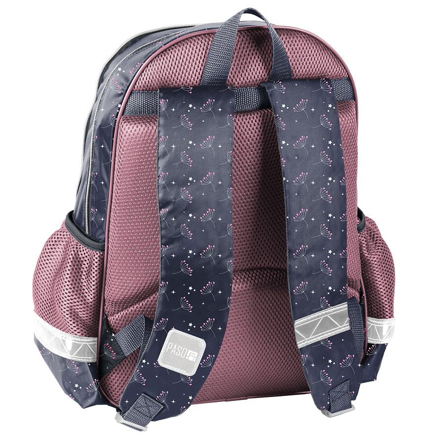 Plecak szkolny jednorożec – Budowa plecaka jest przemyślana i wygodna, co zapewnia dobrą organizację wewnątrz. Produkt składa się z dwóch dużych komór zapinanych na zamek, kieszeni na froncie oraz z dwóch bocznych kieszonek wykonanych z siatki, w których pomieści się butelka, mały termos lub bidon. Elementy odblaskowe umieszczone na plecaku szkolnym jednorożec sprawiają, że dziecko będzie jeszcze bardziej widoczne, a co za tym idzie – bezpieczne. Usztywniane gąbką, ergonomiczne wyprofilowane i pokryte siatką plecy oraz regulowane szelki pokryte miękkim materiałem zapewniają dziecku prawidłową postawę i odciążają kręgosłup. Dzięki tym cechom plecak szkolny jednorożec jest bardzo komfortowy, a noszenie podręczników oraz zeszytów jest niezwykle wygodne. Plecak wyposażony jest w usztywnione dno. Uszyty jest z materiału odpornego na przemakanie.
