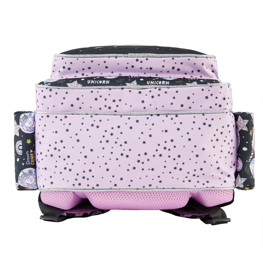 Plecak szkolny Jednorożec. Wyposażony jest w dwie duże komory zapinane na zamek oraz jedną bardzo obszerną kieszeń na froncie. Dwie kieszenie z siatki umiejscowione po bokach swobodnie pomieszczą bidon, małą butelkę lub termos. Plecak posiada liczne elementy odblaskowe, dzięki którym dziecko będzie widoczne na drodze. Usztywniane gąbką, ergonomiczne wyprofilowane plecy oraz regulowane szelki pokryte miękkim materiałem zapewniają dziecku prawidłową postawę i odciążają kręgosłup. Dzięki tym cechom plecak jest bardzo komfortowy, a noszenie podręczników oraz zeszytów jest niezwykle wygodne. Plecak uszyty jest z materiału odpornego na przemakanie.