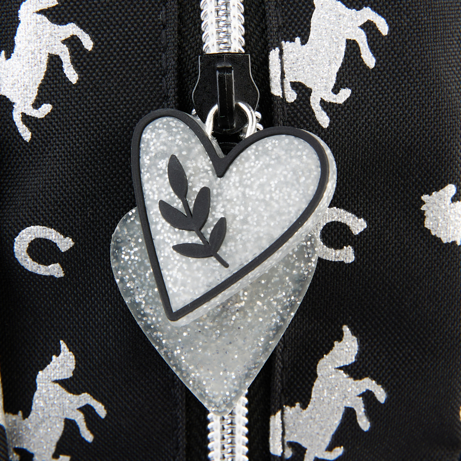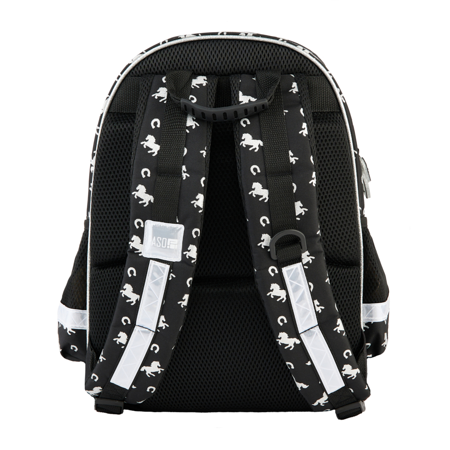Plecak szkolny Koń. Plecak posiada dwie pojemne komory oraz dwie duże kieszenie frontowe. Dodatkowo jest wyposażony w dwie boczne kieszonki z siatki, które doskonale nadają się do przechowywania drobniejszych akcesoriów lub butelki z napojem. Usztywnione gąbką, ergonomiczne wyprofilowane plecy oraz regulowane szelki pokryte miękkim materiałem zapewniają dziecku prawidłową postawę i odciążają kręgosłup. Plecak wyposażony jest w usztywnione dno, wzmocnione i zabezpieczone gumowymi stopkami. Na froncie, bokach i z tyłu posiada elementy odblaskowe, które zwiększają bezpieczeństwo. Uszyty jest z materiału odpornego na przemakanie. Idealnie sprawdzi się zarówno w szkole czy na wycieczce.