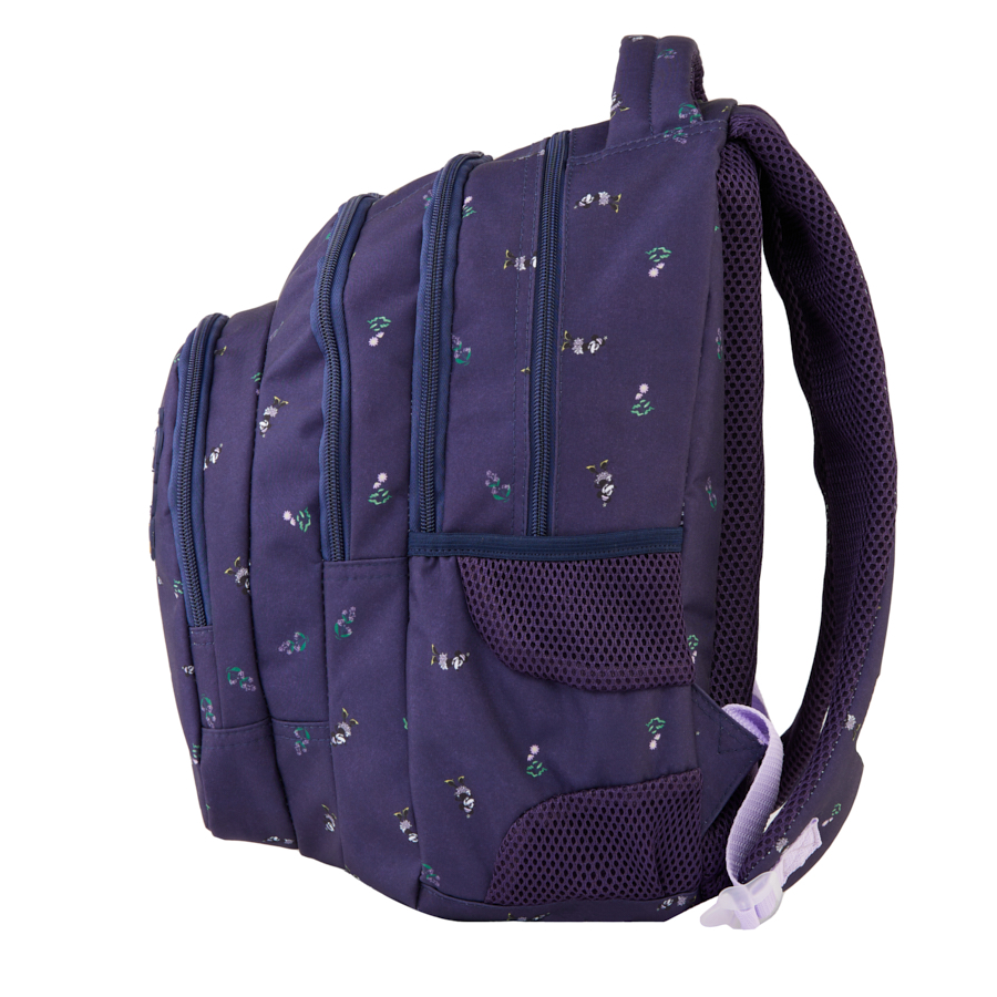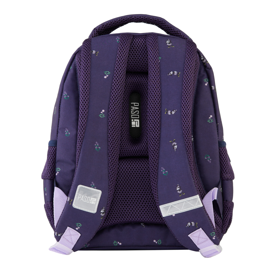 Plecak Paso Minnie, idealny do szkoły. Posiada trzy pojemne komory, kieszeń przednią z organizerem zamykaną na zamek, dwie boczne kieszonki wykonane z siatki oraz materiału, które pomieszczą butelkę, bidon lub termos. W komorze głównej znajduje się przegroda (na laptop), w drugiej komorze organizer z kieszenią na zamek oraz uchwyt na klucze. Jedna z kieszeni plecaka posiada praktyczne wyjście na słuchawki. Wzmocnione profilowane plecy oraz miękkie, regulowane szelki sprawiają, że plecak nosi się niezwykle komfortowo. Plecak posiada wzmocniony i usztywniony spód, co zwiększa jego stabilność, wygodny uchwyt do przenoszenia, uszko do powieszenia oraz elementy odblaskowe dla zwiększenia bezpieczeństwa na drodze lub po zmroku.