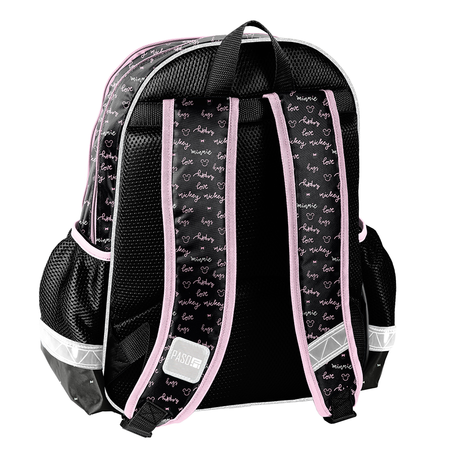 Plecak szkolny Minnie. Budowa plecaka jest przemyślana i wygodna, co zapewnia dobrą organizację wewnątrz. Produkt składa się z dwóch dużych komór zapinanych na zamek, kieszeni na froncie oraz z dwóch bocznych kieszonek wykonanych z siatki, w których pomieści się butelka, mały termos lub bidon. Elementy odblaskowe umieszczone na plecaku sprawiają, że dziecko będzie jeszcze bardziej widoczne, a co za tym idzie – bezpieczne. Usztywniane gąbką, ergonomiczne wyprofilowane i pokryte siatką plecy oraz regulowane szelki pokryte miękkim materiałem zapewniają dziecku prawidłową postawę i odciążają kręgosłup. Dzięki tym cechom plecak jest bardzo komfortowy a noszenie podręczników oraz zeszytów jest niezwykle wygodne. Plecak wyposażony jest w usztywnione dno. Uszyty jest z materiału odpornego na przemakanie.