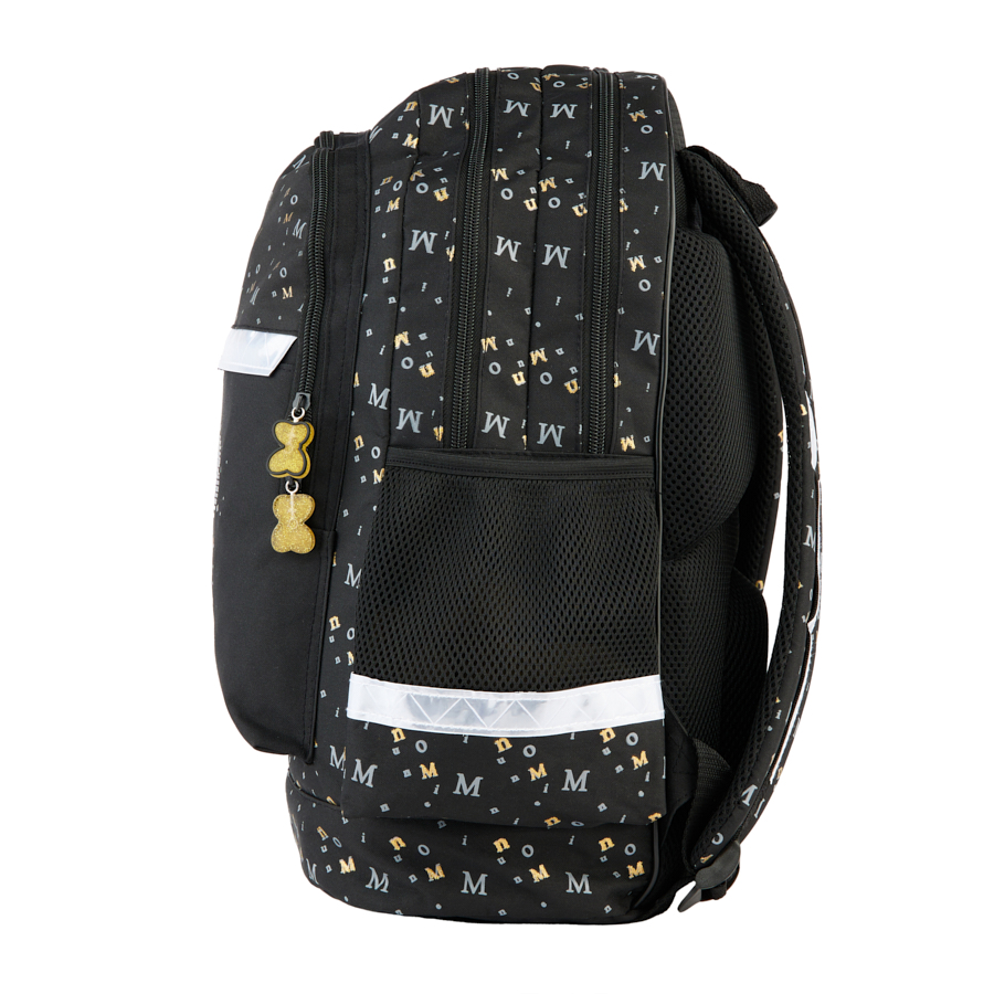 Plecak szkolny Minnie. Plecak posiada dwie pojemne komory oraz dwie duże kieszenie frontowe. Dodatkowo jest wyposażony w dwie boczne kieszonki z siatki, które doskonale nadają się do przechowywania drobniejszych akcesoriów lub butelki z napojem. Usztywnione gąbką, ergonomiczne wyprofilowane plecy oraz regulowane szelki pokryte miękkim materiałem zapewniają dziecku prawidłową postawę i odciążają kręgosłup. Plecak wyposażony jest w usztywnione dno, wzmocnione i zabezpieczone gumowymi stopkami. Na froncie, bokach i z tyłu posiada elementy odblaskowe, które zwiększają bezpieczeństwo. Uszyty jest z materiału odpornego na przemakanie. Idealnie sprawdzi się zarówno w szkole czy na wycieczce.