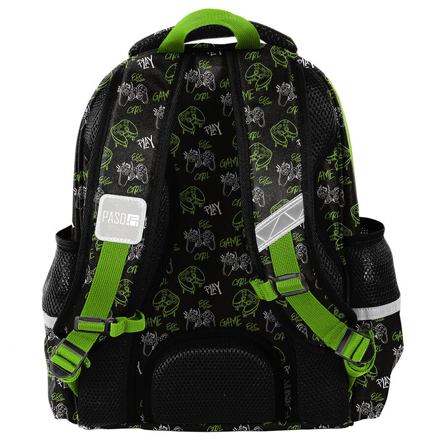 Plecak premium Play Game Pad. Dwukomorowy model o usztywnionej konstrukcji. Komora główna wzbogacona o wewnętrzyne przegrody odpowiadajace za porzadek wśród zapakowanych przedniotów. Komora przednia zawiera organizer oraz funkcjonalne kieszonki na dodatkowe wyposażenie szkolne. Model zawiera również dwie boczne kieszenie z siatki mieszczące małą butelkę, bidon lub termos. Usztywniona konstrukcja wykonana z materiału eva foam, profilowane elementy pokryte siatką oraz pas piersiowy zapewniają komfort noszenia przy zapewnieniu prawidłowej postawy ciała dziecka. Na dnie plecaka zastosowane dwie podkładki chroniące przed uszkodzeniami. Plecak posiada elementy odblaskowe zwiększające widoczność użytkownika po zmroku. Wygodny uchwyt do przenoszenia, uchwyt do zawieszenia oraz pullery ułatwiające odpinanie zamków nadają całości niepowtarzalnego charakteru.