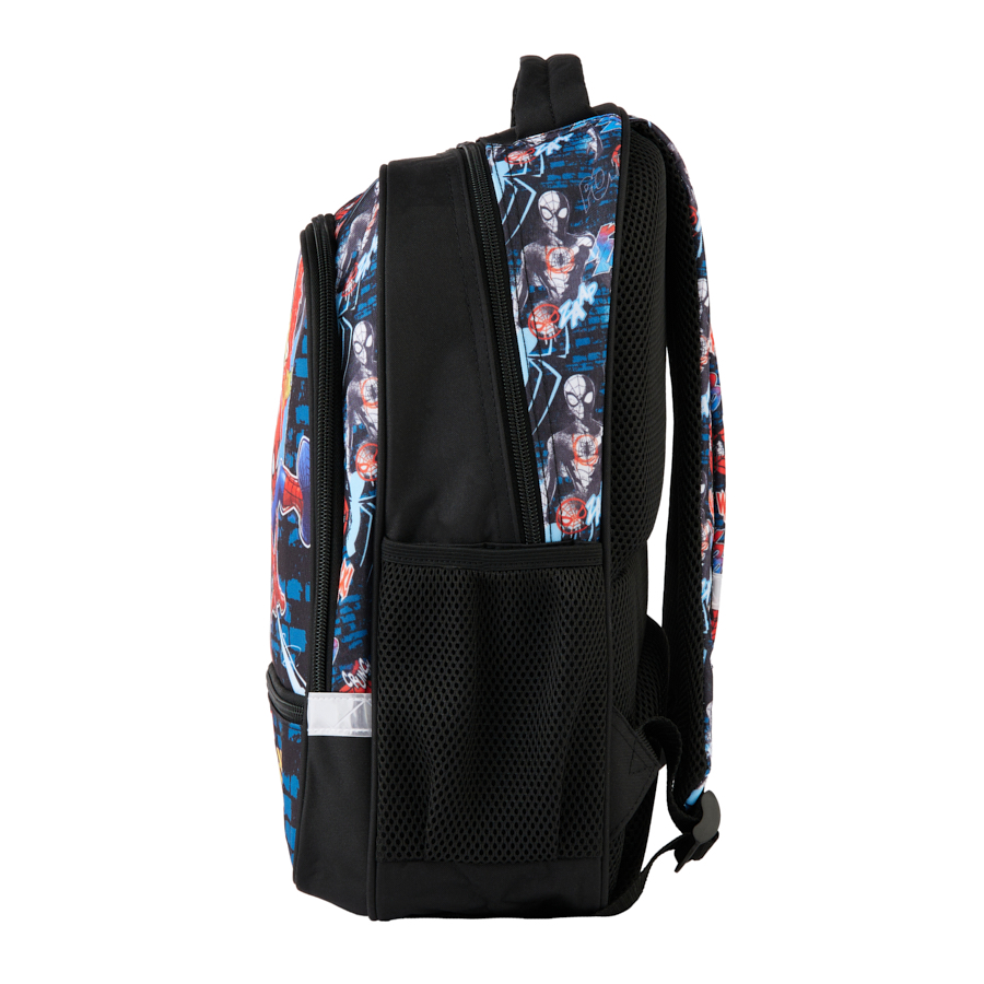Plecak szkolny Spider-Man. Produkt składa się z dwóch dużych komór, kieszeni na froncie oraz z dwóch bocznych kieszonek wykonanych z siatki. W kieszonkach z łatwością pomieści się termos czy bidon. Elementy odblaskowe umieszczone na plecaku sprawiają, że dziecko będzie jeszcze bardziej widoczne, a co za tym idzie – bezpieczne. Usztywniane gąbką, ergonomiczne wyprofilowane plecy oraz regulowane szelki pokryte miękkim materiałem zapewniają dziecku prawidłową postawę i odciążają kręgosłup. Dzięki tym cechom plecak jest bardzo komfortowy, a noszenie podręczników oraz zeszytów jest niezwykle wygodne. Plecak wyposażony jest w wygodny uchwyt do przenoszenia oraz usztywnione i wzmocnione dno. Wygodne ozdobne pullery ułatwiają odpinanie zamków. Plecak uszyty jest z materiału odpornego na przemakanie.