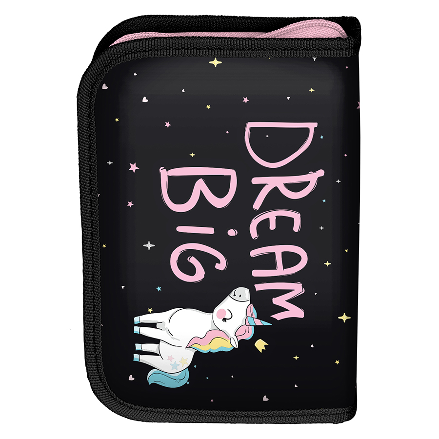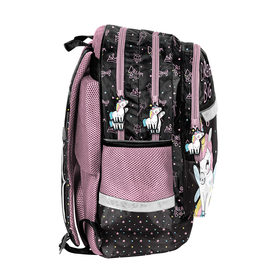 Plecak szkolny Unicorn. Plecak posiada dwie pojemne komory oraz dwie duże kieszenie frontowe. Dodatkowo jest wyposażony w dwie boczne siatki, które doskonale nadają się do przechowywania drobniejszych akcesoriów lub butelki z napojem. Usztywnione gąbką, ergonomiczne wyprofilowane plecy oraz regulowane szelki pokryte miękkim materiałem zapewniają dziecku prawidłową postawę i odciążają kręgosłup. Plecak wyposażony jest w zabezpieczone stopkami gumowymi dno. Posiada elementy odblaskowe, które zwiększają bezpieczeństwo. Uszyty jest z materiału odpornego na przemakanie. Idealnie sprawdzi się zarówno w szkole czy na wycieczce.