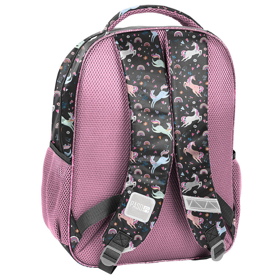 Plecak szkolny Unicorns are real. Produkt składa się z dwóch dużych komór, kieszeni na froncie oraz z dwóch bocznych kieszonek wykonanych z siatki. W kieszonkach z łatwością pomieści się termos czy bidon. Elementy odblaskowe umieszczone na plecaku sprawiają, że dziecko będzie jeszcze bardziej widoczne, a co za tym idzie – bezpieczne. Usztywniane gąbką, ergonomiczne wyprofilowane plecy oraz regulowane szelki pokryte miękkim materiałem zapewniają dziecku prawidłową postawę i odciążają kręgosłup. Dzięki tym cechom plecak jest bardzo komfortowy, a noszenie podręczników oraz zeszytów jest niezwykle wygodne. Plecak wyposażony jest w wygodny uchwyt do przenoszenia oraz usztywnione i wzmocnione dno. Wygodne ozdobne pullery ułatwiają odpinanie zamków. Plecak uszyty jest z materiału odpornego na przemakanie.