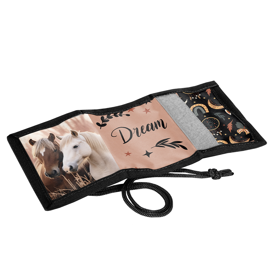 Portfel Horses ze sznurkiem to idealne rozwiązanie dla osób, które cenią sobie funkcjonalność i porządek. Jego wnętrze oferuje szereg praktycznych przegród, które pozwalają na doskonałą organizację wszystkich drobiazgów. Znajduje się tam kieszonka na zamek, idealna do przechowywania monet, oraz przezroczysta kieszonka na małe zdjęcia. Obszerna kieszeń na banknoty zajmuje całą długość portfela po rozłożeniu, a dodatkowe dwie przegródki są świetnym miejscem na różne notatki czy dokumenty. Model wyposażony jest w sznurek, który umożliwia łatwe zawieszenie lub przymocowanie portfela, co zapewnia jeszcze większą wygodę użytkowania.