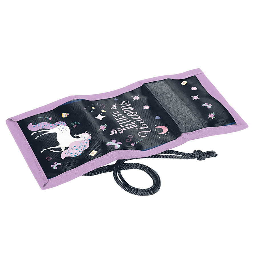 Portfel Magic Unicorn z praktycznym sznurkiem to doskonałe rozwiązanie dla każdego fana bajek. Posiada liczne funkcjonalne przegródki, które gwarantują świetną organizację. Wewnątrz znajduje się kieszonka na zamek idealna na monety oraz przezroczysta przegroda na małe zdjęcie. Obszerna kieszeń sięgająca całą długość portfela pomieści banknoty, a dodatkowe dwie przegródki są świetne do przechowywania różnych informacji. Model został wzbogacony o sznurek, dzięki któremu możesz go wygodnie zawiesić lub przymocować.