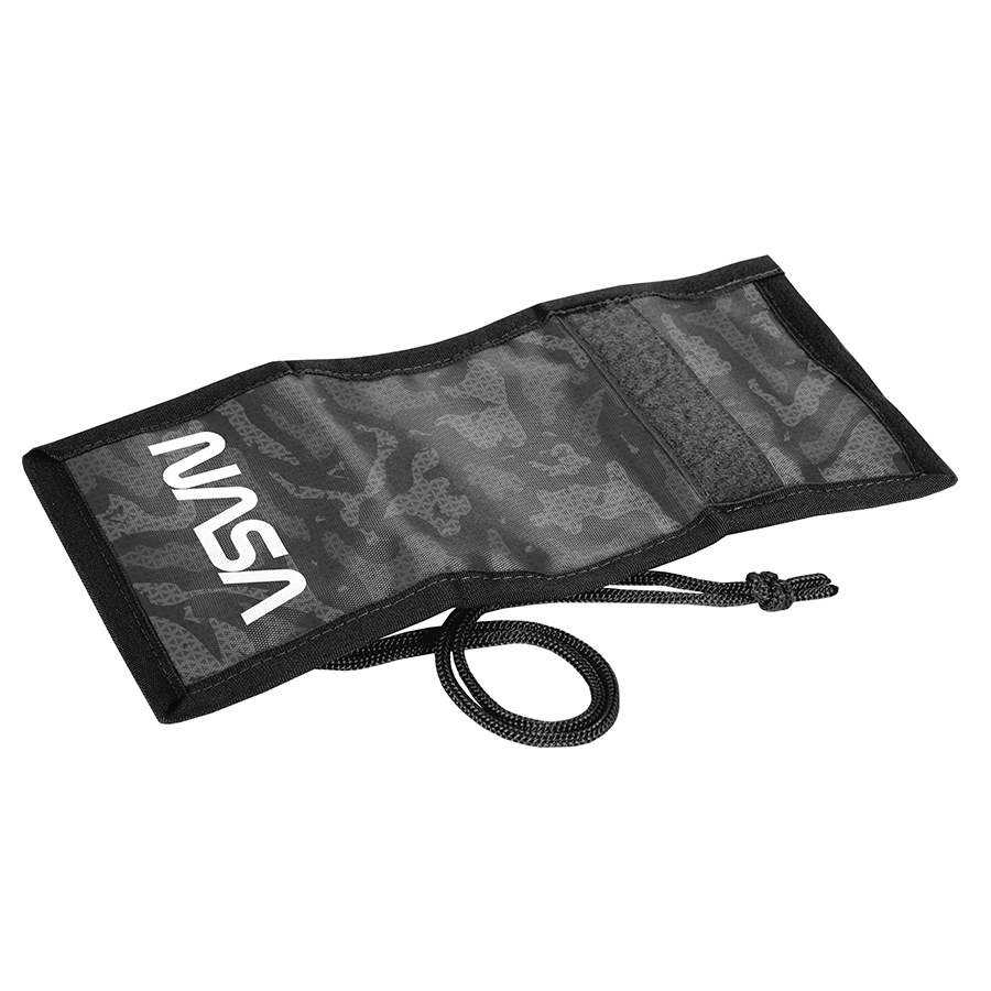Portfel Nasa Camo ze sznurkiem. Portfel posiada wiele funkcjonalnych przegród zapewniających dobrą organizację. Wewnątrz zapinana kieszonka na monety oraz dodatkowa przeźroczysta. Obszerna kieszeń przez całą długość rozłożonego na płasko portfela mieści papierowe banknoty, a dwie dodatkowe przegrody mogą przydać się do przechowywania różnych informacji. Model wyposażony został w sznureczek umożliwiający zawieszenie lub przymocowanie produktu.